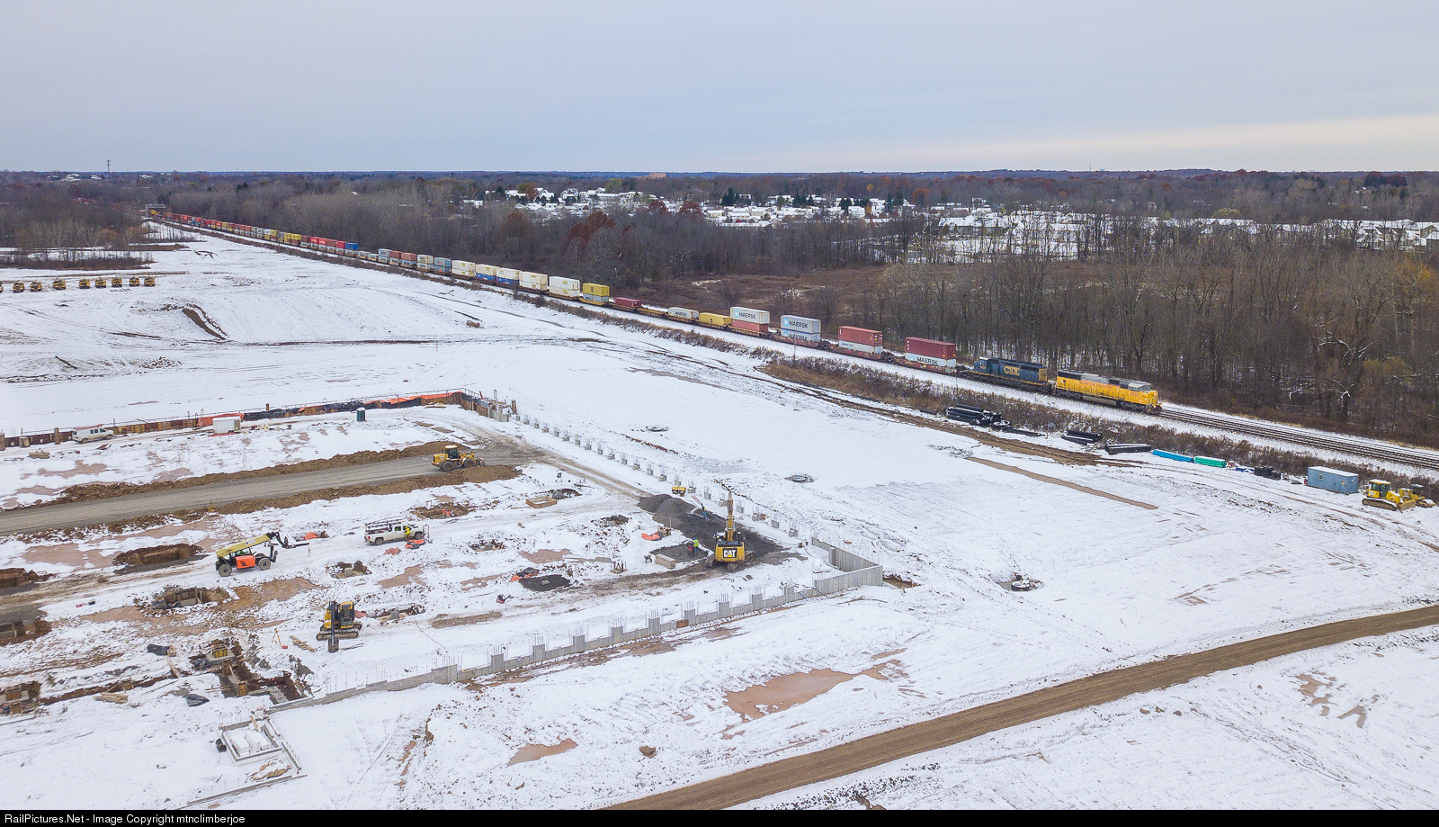 | A UP SD60M and CSX SD40-3 lead CSX intermodal Q390 as it cruises east through Chili Junction in Chili, New York. Construction crews are hard at work at the site of the future C&M Forwarding freight warehouses. |