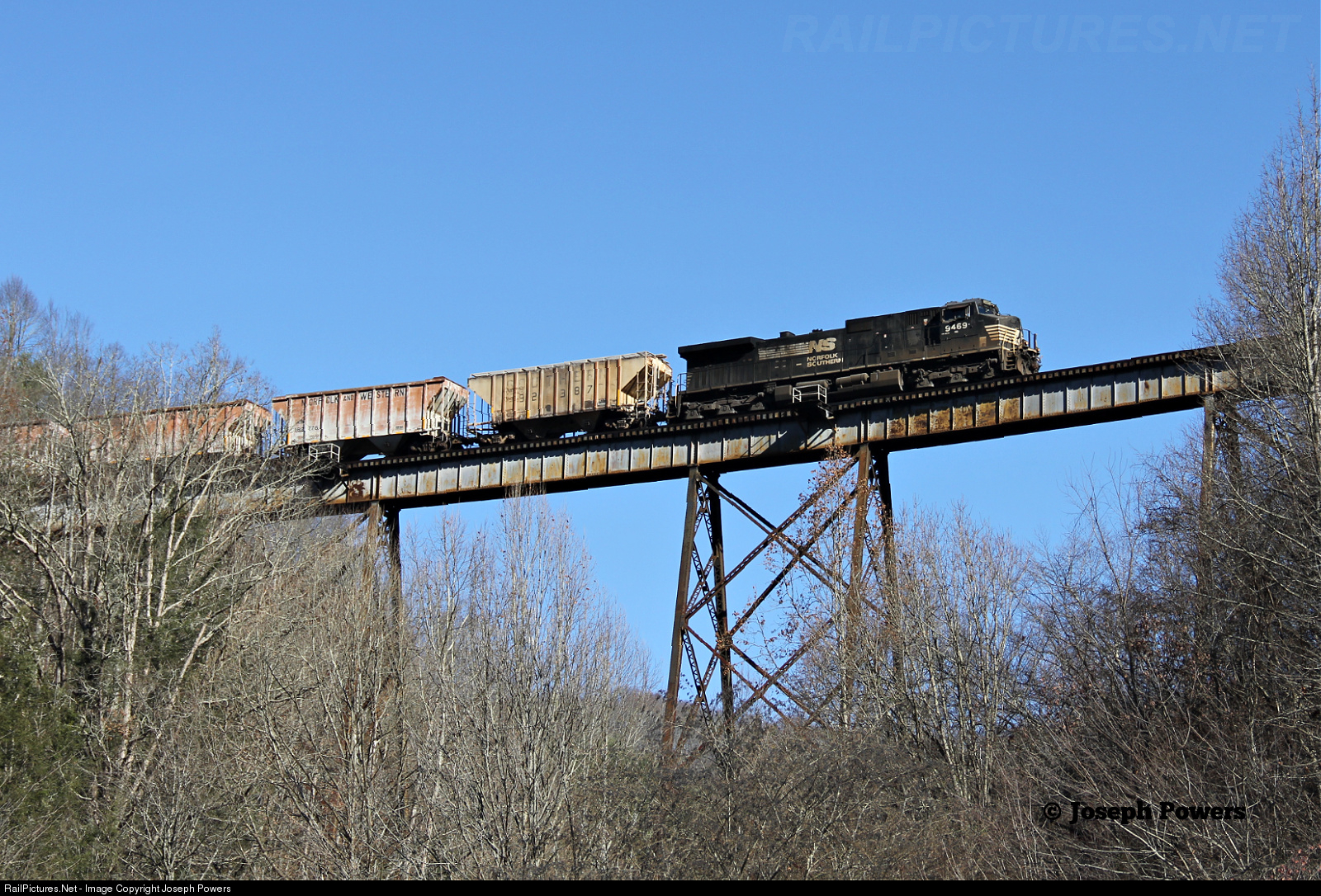 Norfolk Southern "mine run" train U47 rolls east across Kennedy Trestle near the community of Dwina, Virginia between the towns of Coeburn and St. Paul. The train is headed to Swords Creek, Virginia with eleven empty covered hoppers to work E. Dillon and Company.