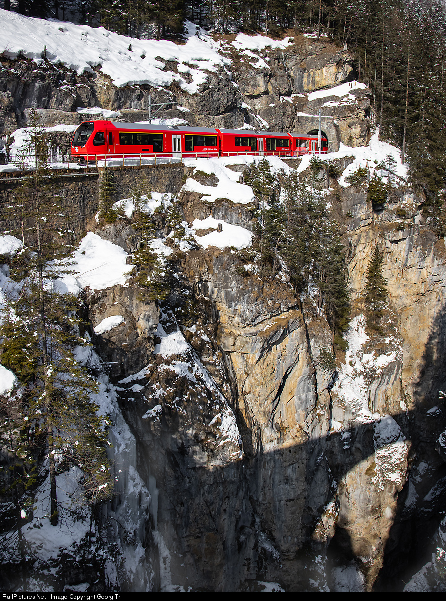 | The new "Capricorn" train ABe 4/16 # 3118 is running the regional train 1829 from Davos Platz to Filisur through the Zügen gorge, entering Davos Wiesen station on the abyss to the Landwasser river. Note the shadow of the old road bridge, on which the photographer is standing. |