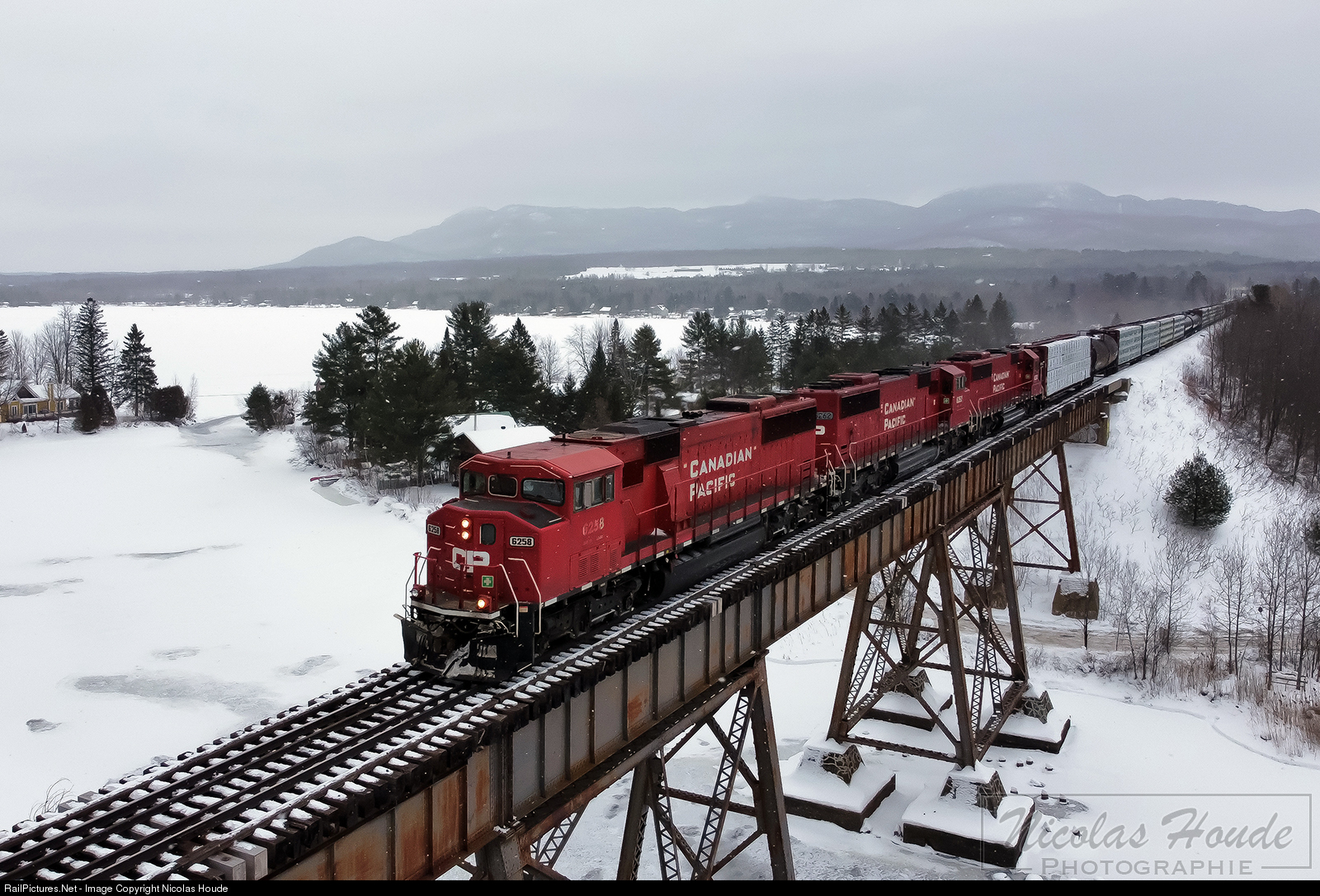 As it passes on the well-known Eastman trestle, CP 251 is powered by an ex-SOO SD60 trio as it rolls towards Farnham in a light snow. A bit ironic for me to see CP rolling again on that subdivision after seeing CDAC, MMA, and CMQ rolling at the same location. |