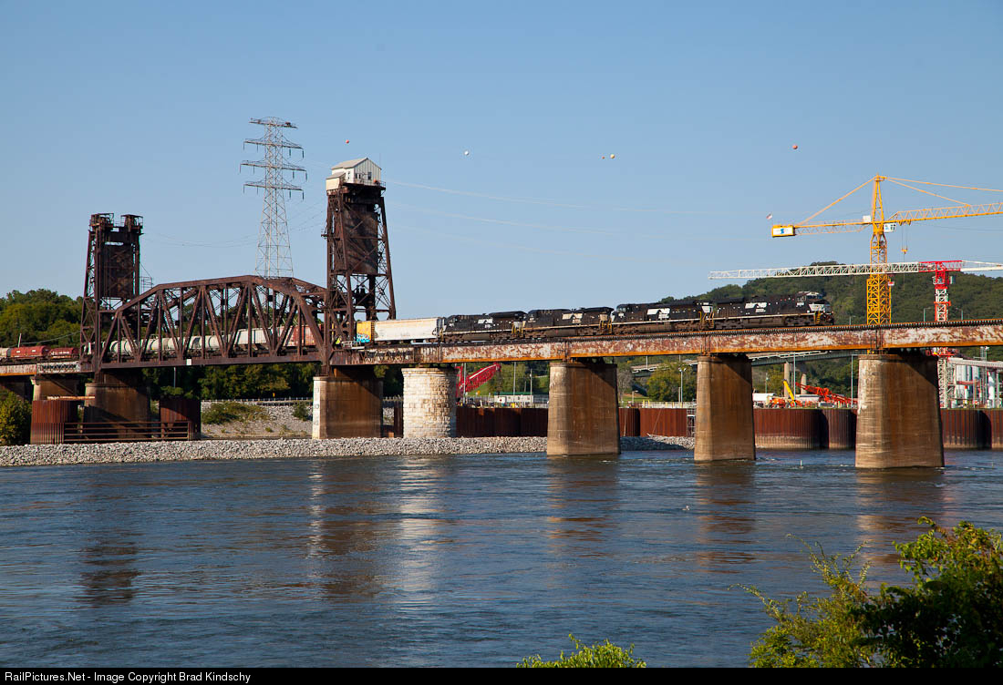 Class ES44AC leads Oakwood, MI to Chattanooga, TN train 189 through NS Tenbridge, so named for the Tennessee River below. Construction of the lock into Lake Chickamauga is evidenced by the multiple cranes.