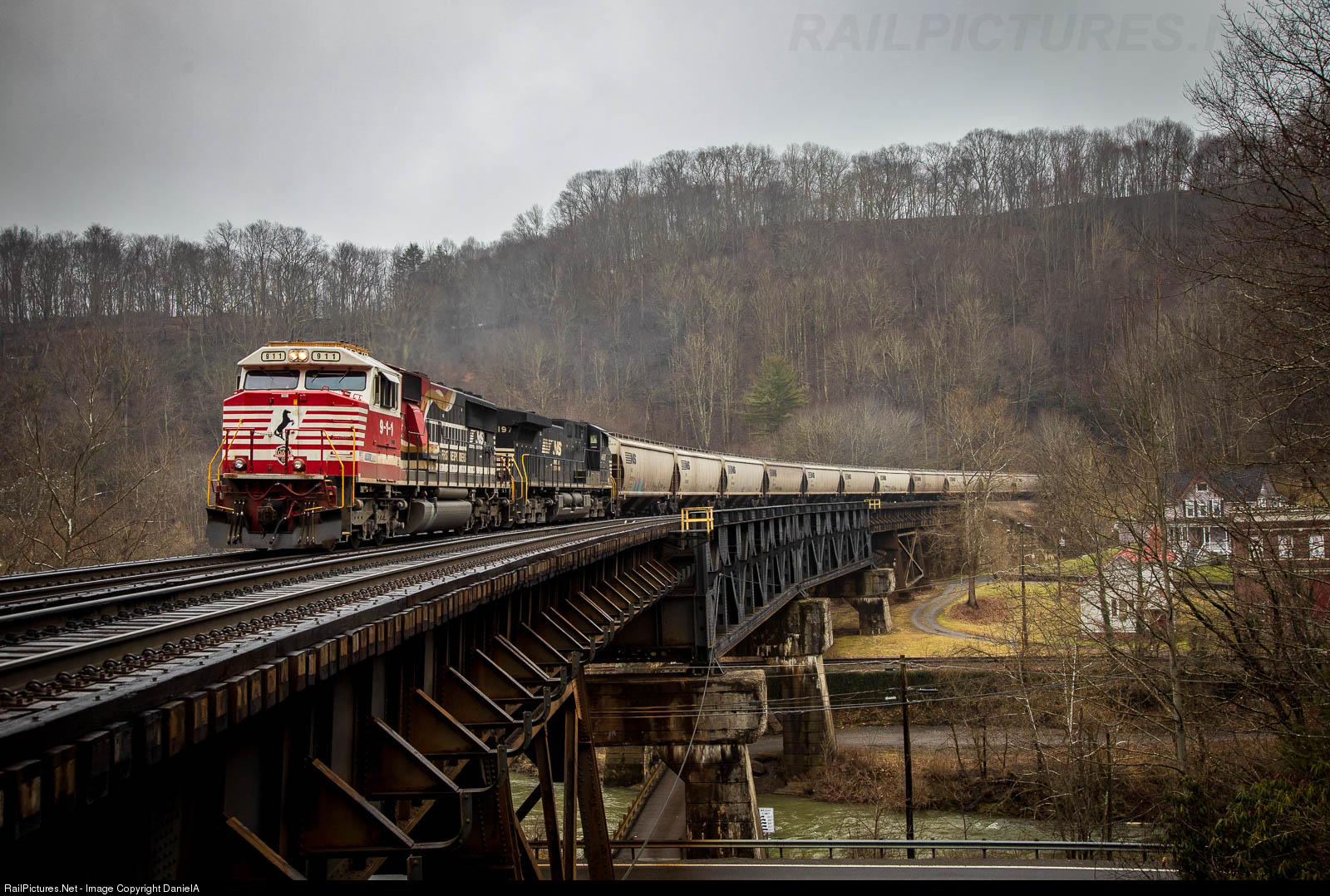 | NS 51V soars over Coopers Trestle in Bramwell, Wv with SD60e #911 in charge. The unit has been in local services for over a year now, so it was nice to see it with a main line train again. This train came into Roanoke the day before with standard black NS power, but the power was changed to this before leaving Roanoke. |