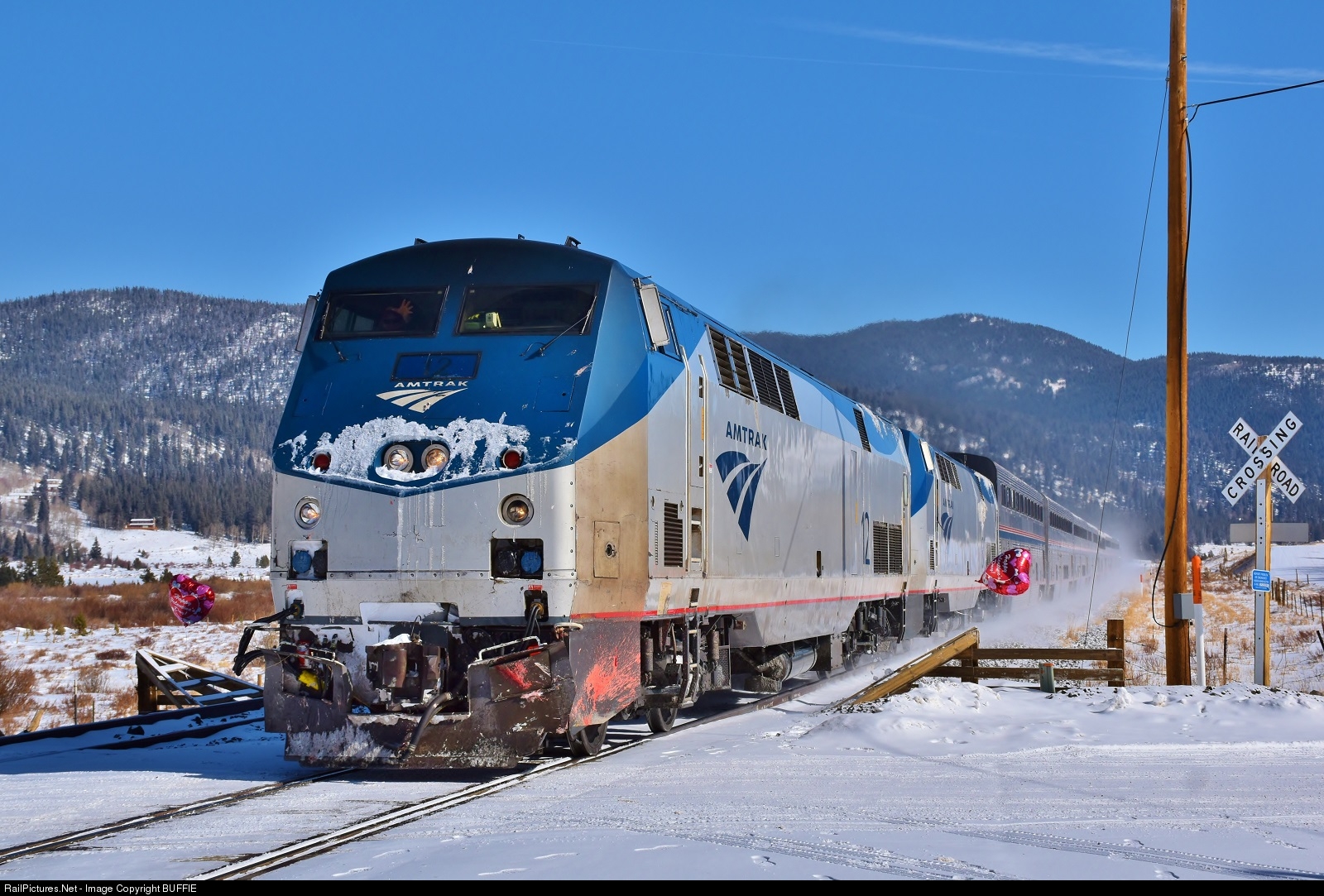 | Valentines Day balloons greet the crew and passengers of the California Zephyr as it passes through Tolland, Colorado on the way to the Moffat Tunnel. The sunny skies are deceiving, as the temperature in the Rocky Mountains bottomed out at -13 degrees Fahrenheit, with a wind chill of -30 F due to a 10 mph breeze. |