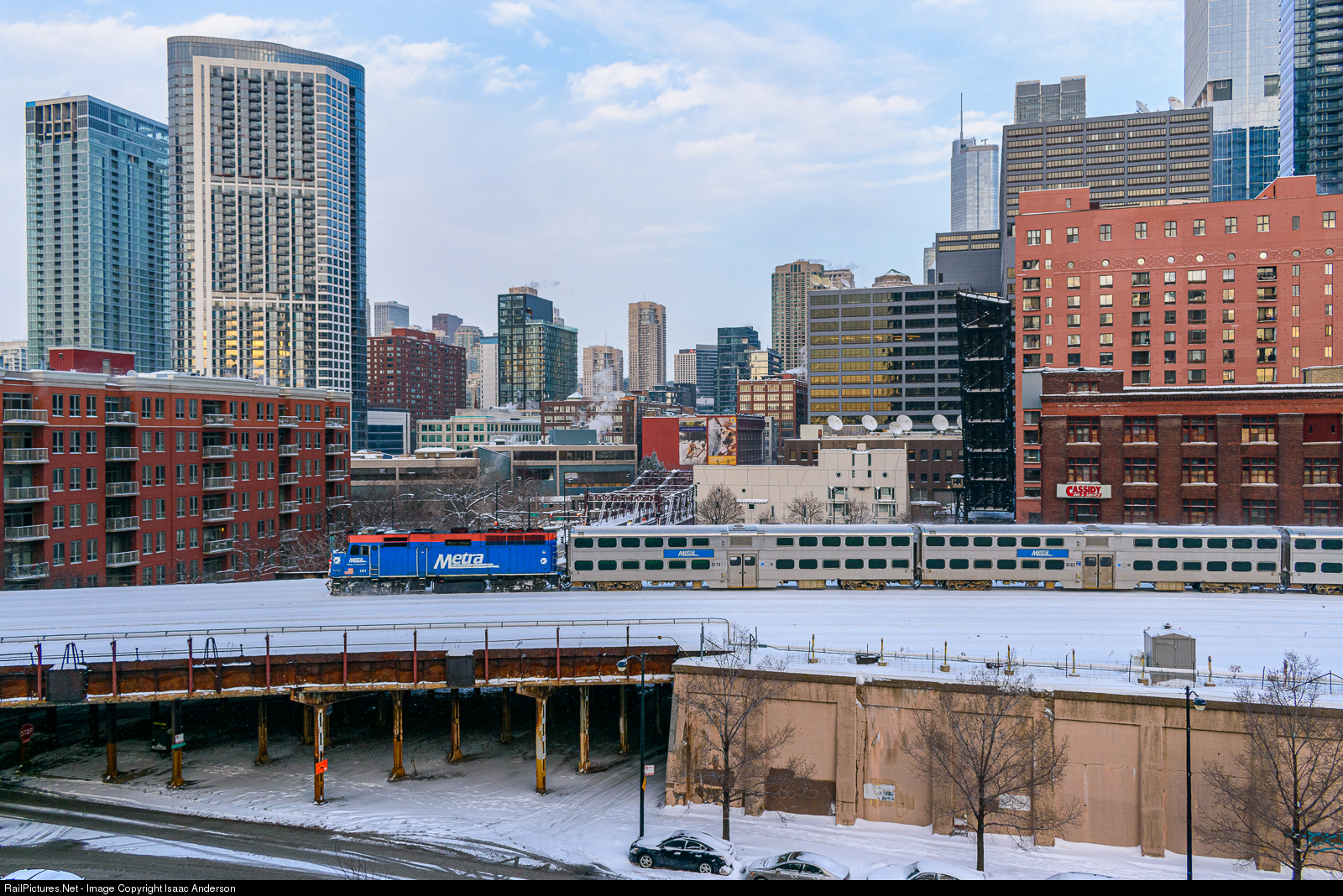 | Metra UP-North leaving Chicago out of Ogilvie Transportation Center. The snow had cleared up from the earlier half of the afternoon in time for some of the low sunlight before night would fall.
