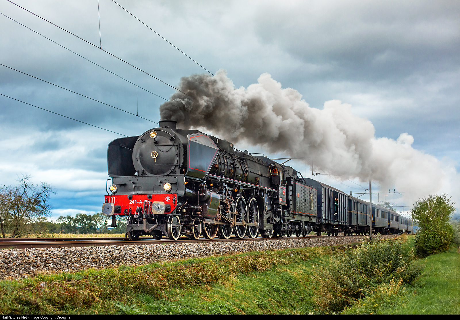 Former French Railways SNCF 4-8-2 "Mountain" 4 cylinder compound express train steam locomotive 241 A # 65 built in 1931 by Fives/Lille for the ETAT railway company, owned and operated now by association 241 A 65 in Full/Argovie, Switzerland, is racing through the Thur valley near Hüttlingen-Mettendorf with about 100 km p.h. Since 2018, this impressive largest hand fired operational steamlocomotive of Europe is undergoing new boiler tubes work in Full/Argovie, as well as other work such as replacement of stud bolts, over-torquing of wheel sets, etc. The locomotive has a maximal power of about 2570 kW and 110 km/h (68 mph) maximum velocity, driving wheel diameter is 1950 mm (6,4 ft). She was withdrawn by the SNCF in 1965 and was purchased by the swiss gentleman Armin Glaser in 1968 and brought to Switzerland. In 1996 she was renovated and made operational in the Dampflokwerk Meiningen/Germany.