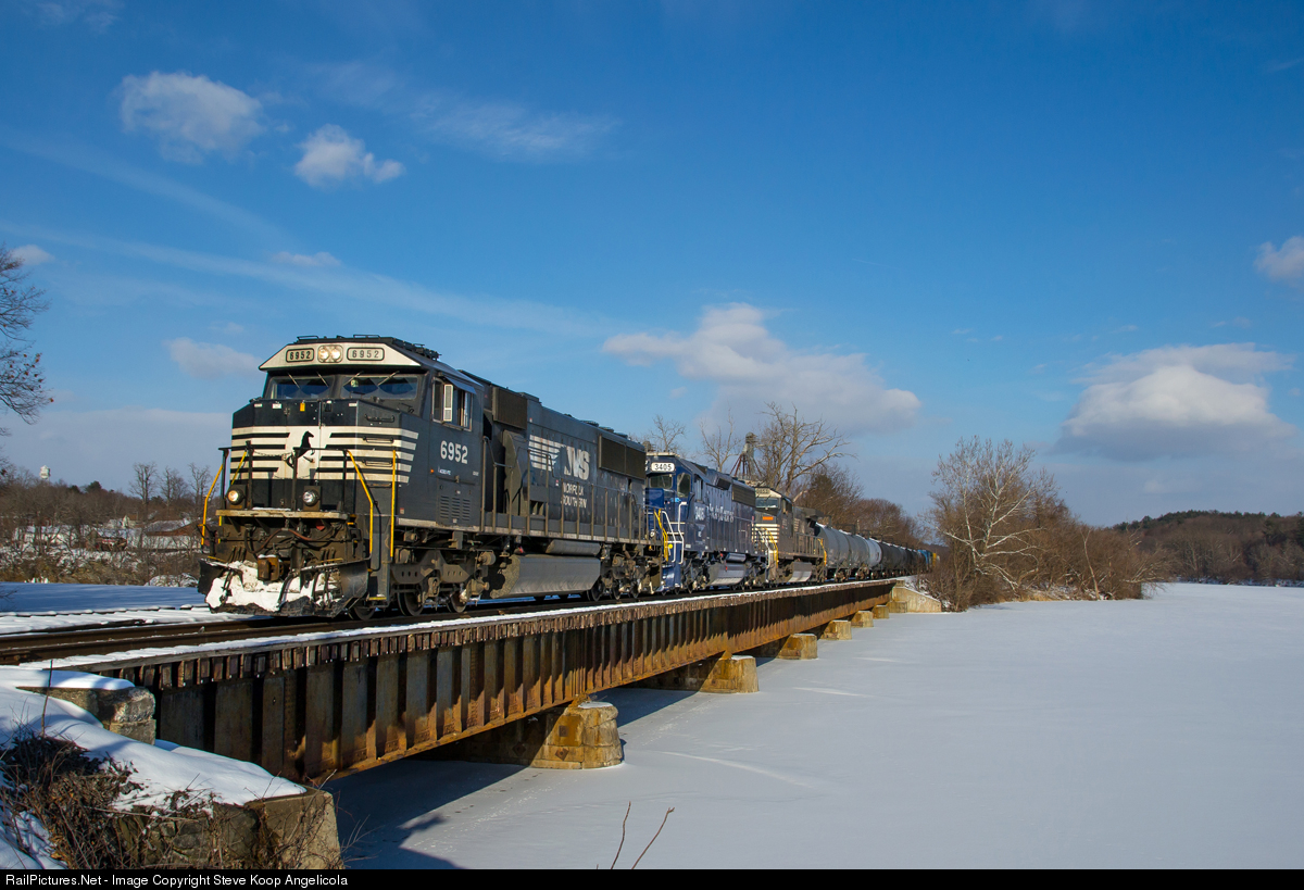 | Pan Am Railway train 11R crosses the Hoosic River at Schaghticoke, NY. NS 6952, MEC 3405, NS 9853 |