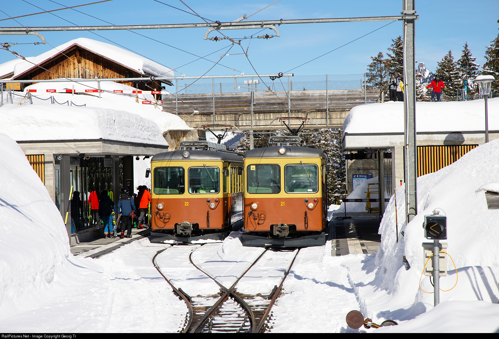 Crossing of two trains of the Bergbahn Lauterbrunnen-Mürren (BLM) in Winteregg (1578 meter a.s.l.), half way between Grütschalp and Mürren. Railcar Be 4/4 # 22 is running train R 746 from Mürren to Grütschalp, while Be 4/4 # 21 is running in the opposite direction as train R 3757. The 3 railcars # 21 to # 23 of the BLM were built in 1967 by SIG, BBC and SAAS. The 4,2 kilometer long 1 meter gauge railway between Grütschalp and Mürren is electrified with 560 V DC and was openend in 1891. It is part of the Jungfraubahn Holding nowadays.