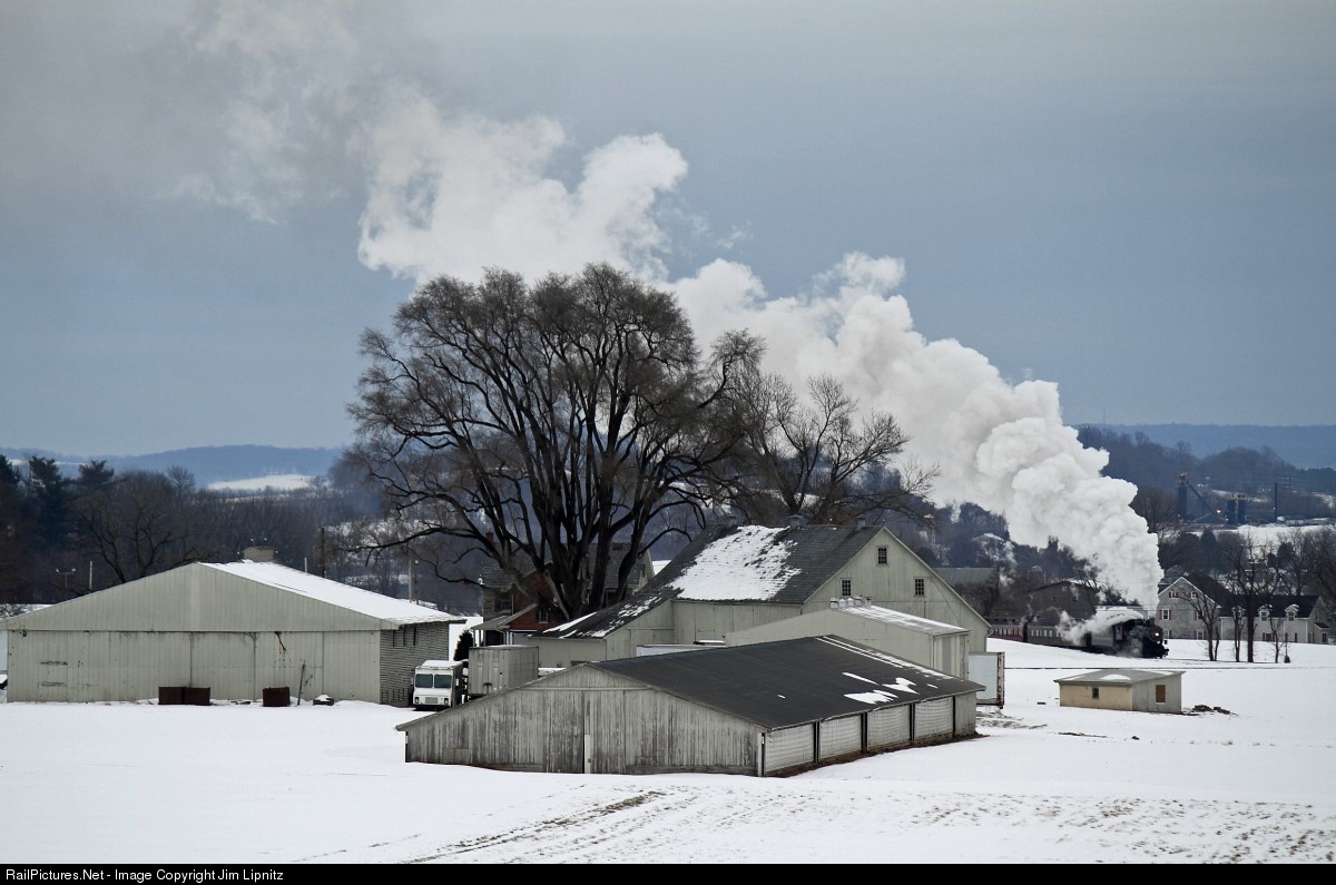 On a rather chilly President's Day weekend, the traditional opening day of the weekend, former Norfolk & Western 4-8-0 #475 pulls the 3 pm train on Saturday, February 13, 2021, towards the Esbenshade Road grade crossing. Soon she'll pass the Esbenshade Turkey Farm, seen here. The photo was taken from the Red Caboose Motel's silo/overlook, available to shoot from for a 50 cent donation.