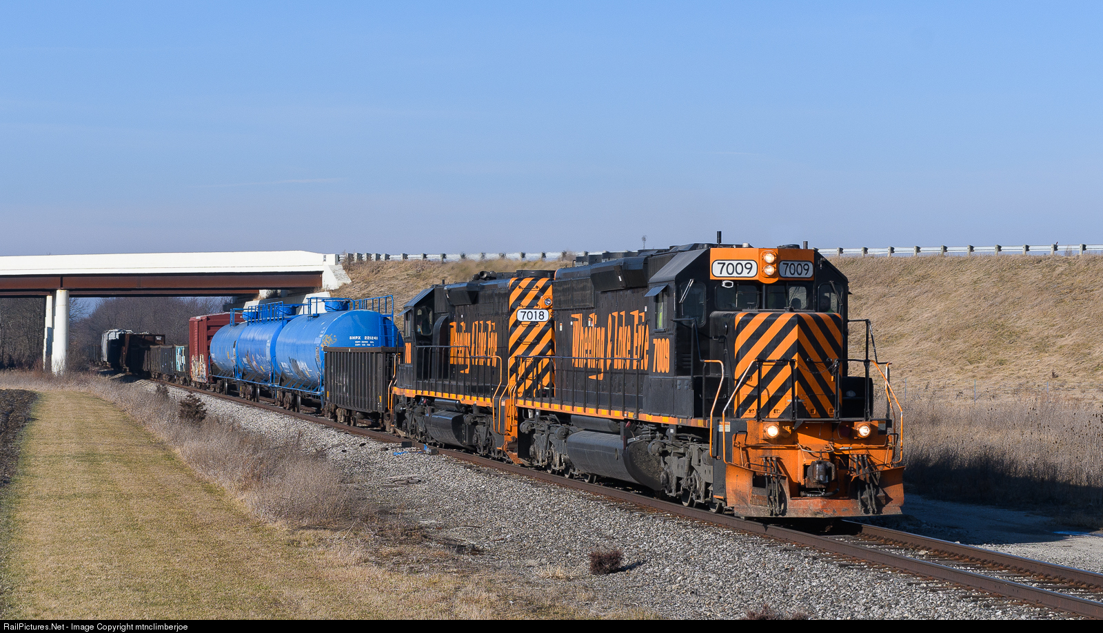 | A pair of Wheeling & Lake Erie SD40-2's roll under Route 30 as they accelerate out of a slow order in Nevada, Ohio. Train 430 is running east over the CF&E from Lima to home rails in Brewster. |