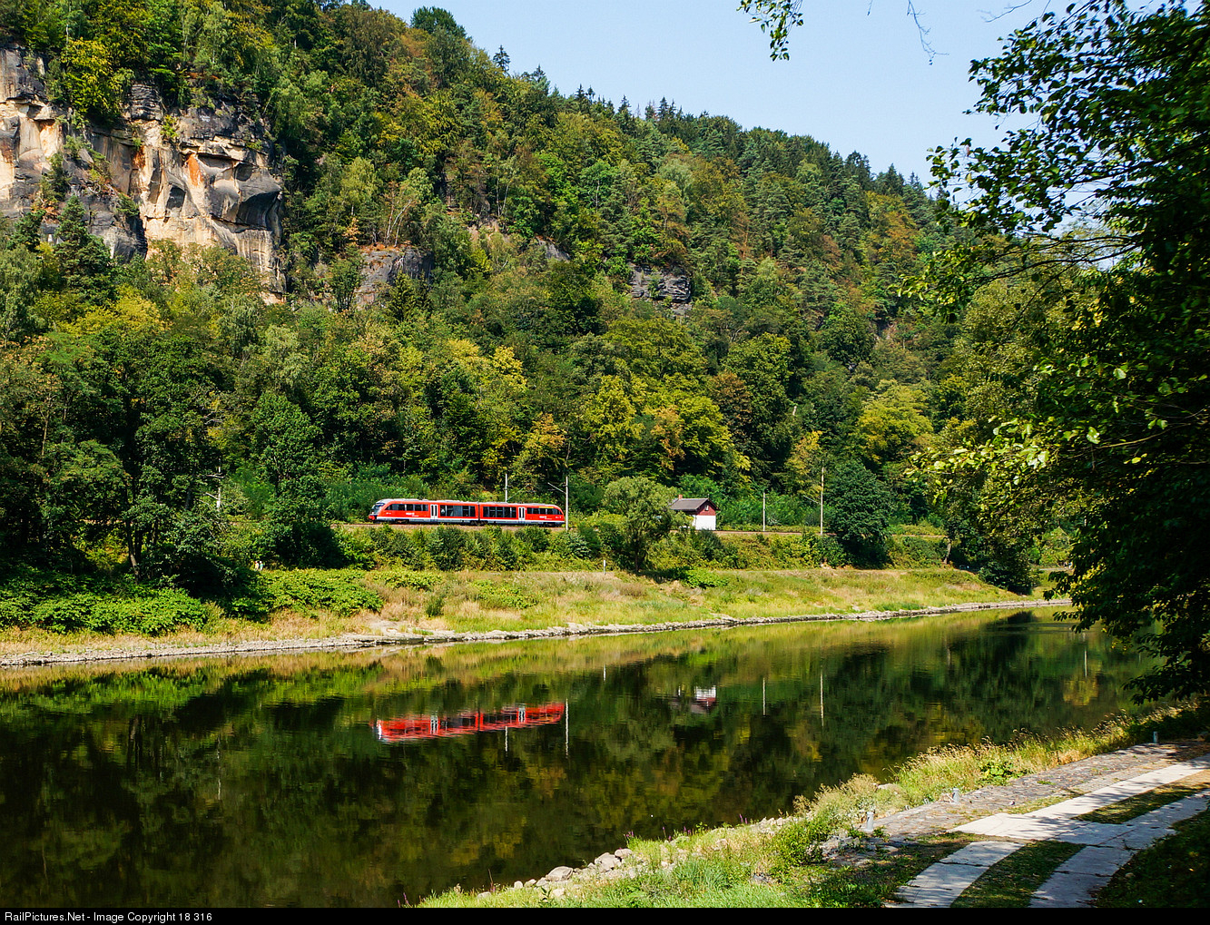 | Mirrored in the Elbe (Labe) river, a DMU on a U28 cross-border local service from Rumburk to Děčín (both in the Czech Republic) via Bad Schandau (in Germany) left German border station Schöna and will cross the border in half a minute. |
