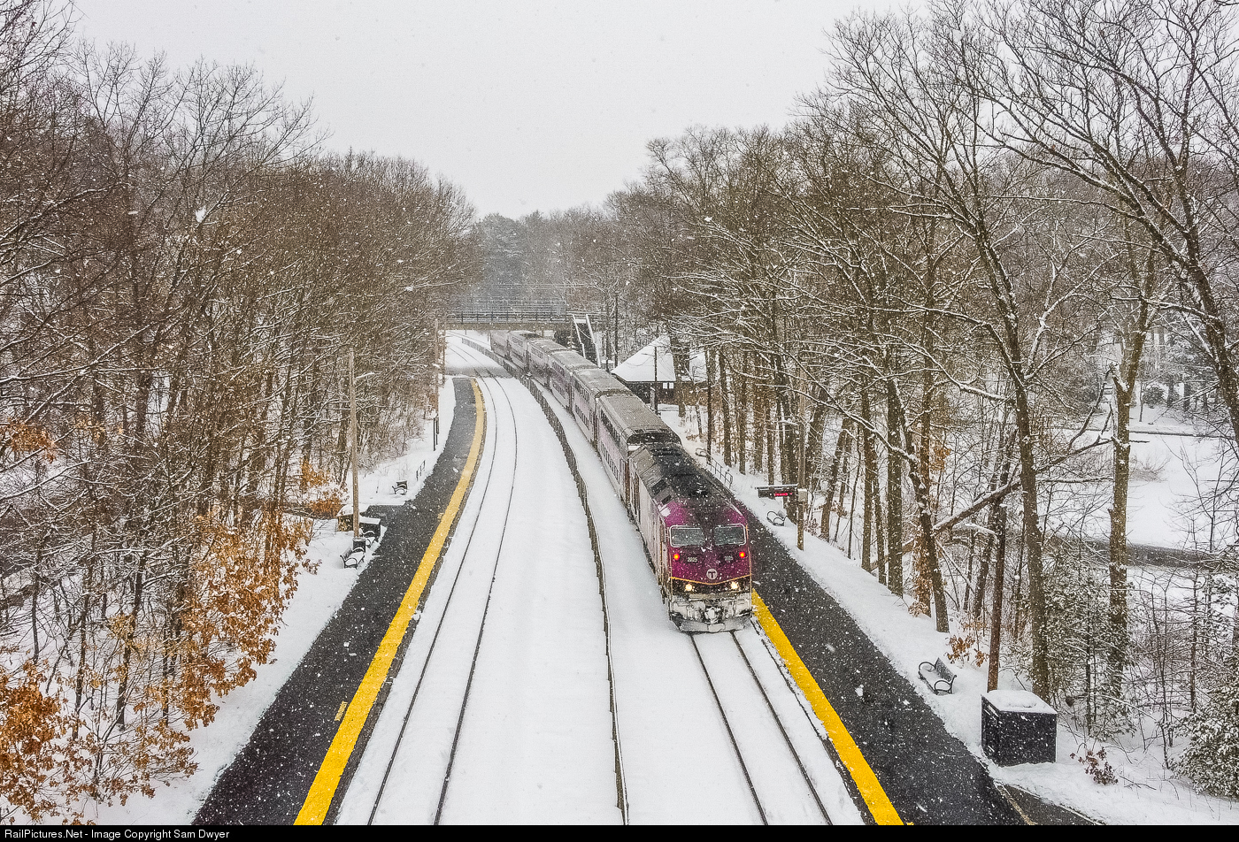On February 19, 2021, I braved the snowstorm to get some drone shots of local commuter trains at Wellesley Farms. This shot was taken around 11 in the morning after it had been lightly snowing for about 12 hours. Powering this inbound is HSP46 #2025, which wouldn't be very interesting if it wasn't for the ditchlights, which were on despite the train going inbound. I guess the engineer forgot to turn them off in Worcester.
