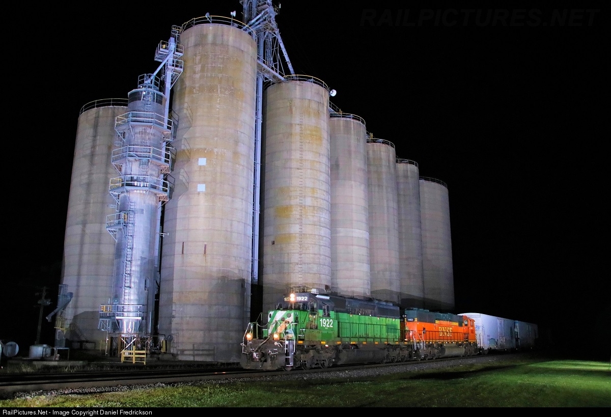 BN still lives! BNSF 1922, an SD40-2 still sporting its Cascade Green paint scheme, leads BNSF local R-CHI472 past the towering grain elevators in the small community of Chana, IL, a few miles east of Oregon, where the local had just finished working. Good to see one of these on the mainline, as most are confined to working in yards.