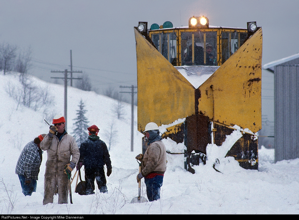The man-in-charge on the ground explains what needs to be done to the operating crew aboard Wisconsin Central Jordan spreader No. 315 before plowing out the railroad’s snow-covered yard at Ishpeming, Michigan, on December 29, 1996. Beside plowing snow on the track the train is on, the hydraulic-powered blades that can extend from the sides of the machine are very useful in pushing snow off adjoining tracks in the yard.