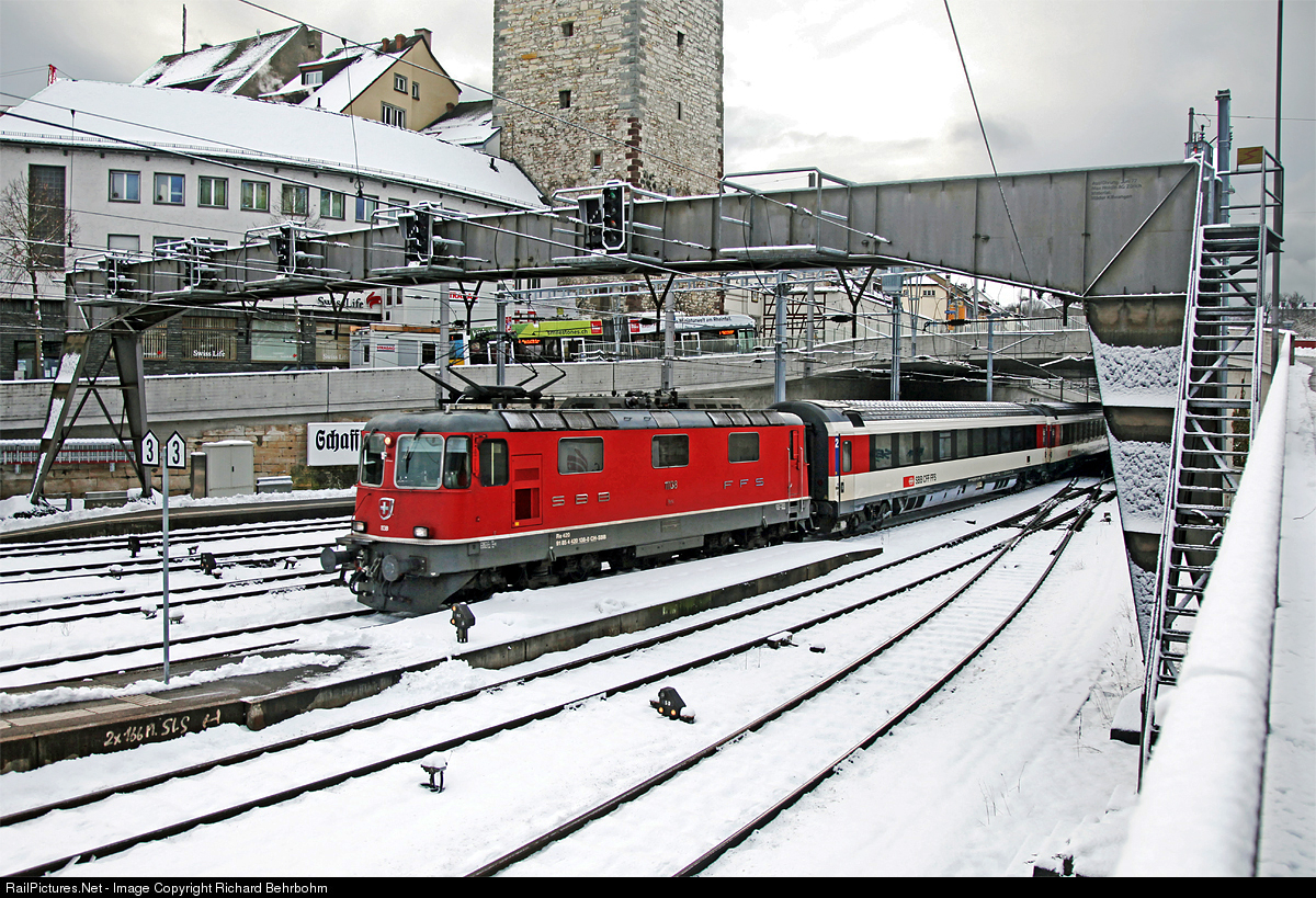 | On a snowy day this winter Re 420 138 with IC 282 Zurich - Stuttgart arrives in Schaffhausen. |
