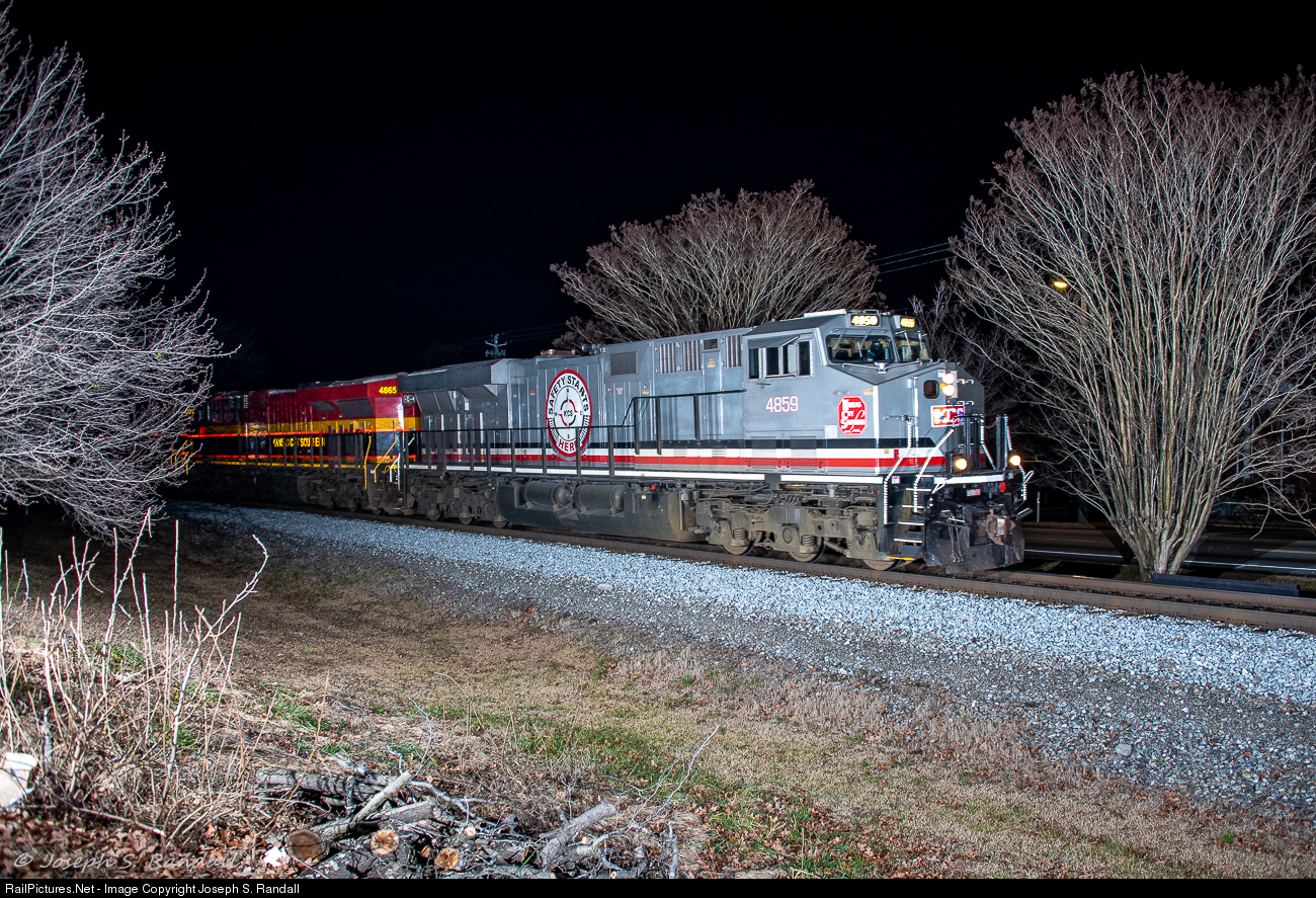 | Minutes before the clock turns over to the new day, NS 219 is seen sprinting west for Birmingham & points west with KCS 4859, their "Safety Starts Here" painted-GEVO on the point. |