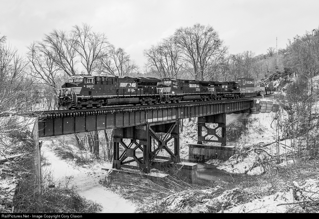 | In the monochrome of dormant trees and white snow, NS's daily intermodal 236's spans an ice-covered Elijah Creek with snow still frozen to the ground following the 2021 Ice Storm that spread heavy damage from eastern Kentucky to central West Virginia. |