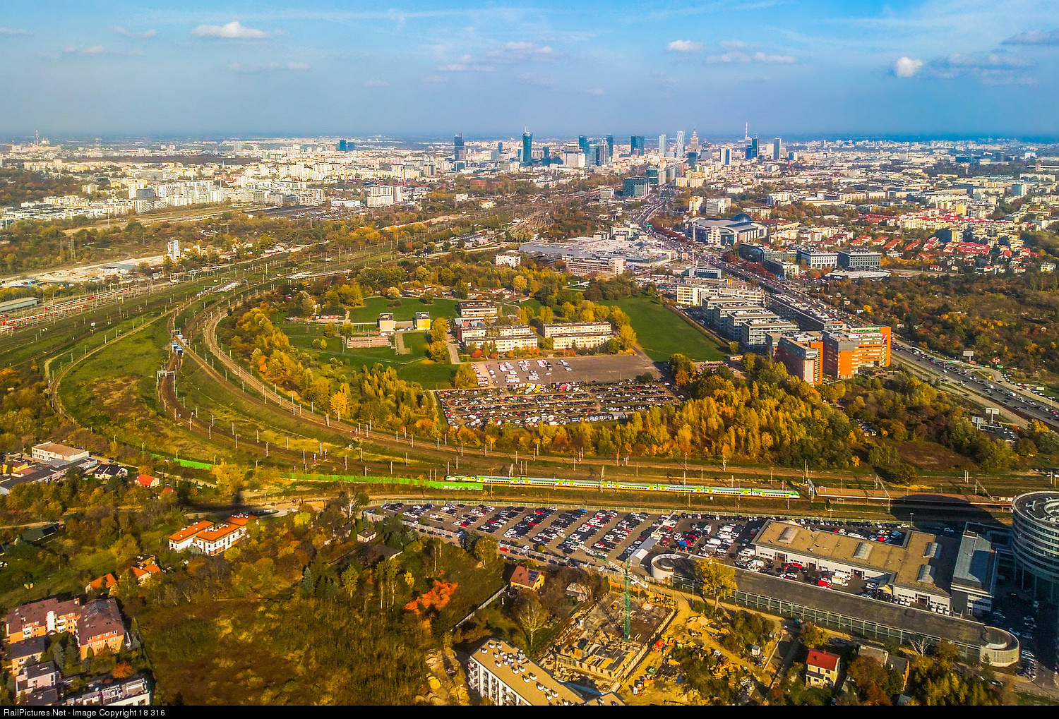 | A double-deck push-pull set as local train from Warshaw to Radom is approaching its next stop, with the tracks from the central station and the centre of the Polish capital in the distance. |