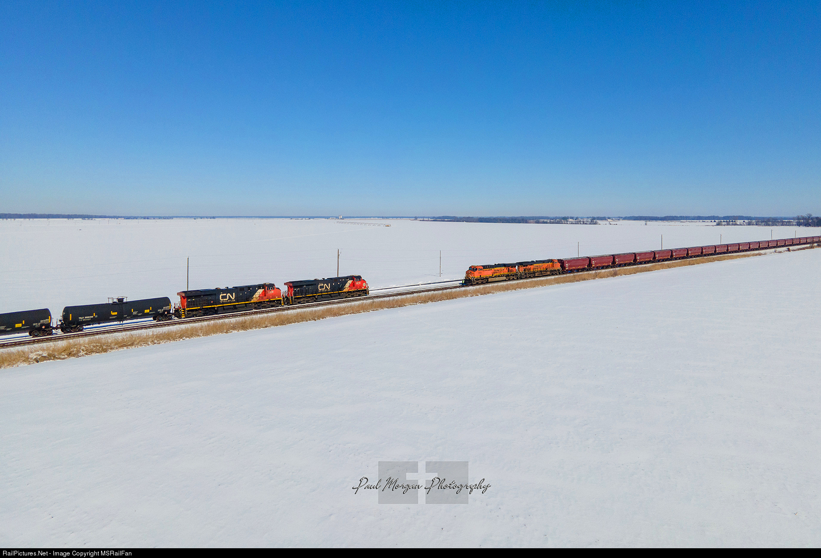A BNSF-led loaded CN grain train holds the main for CN U757 north bound oil train. CN U757 had two more south bound trains to meet before it was able to make it into Harrison Yard.