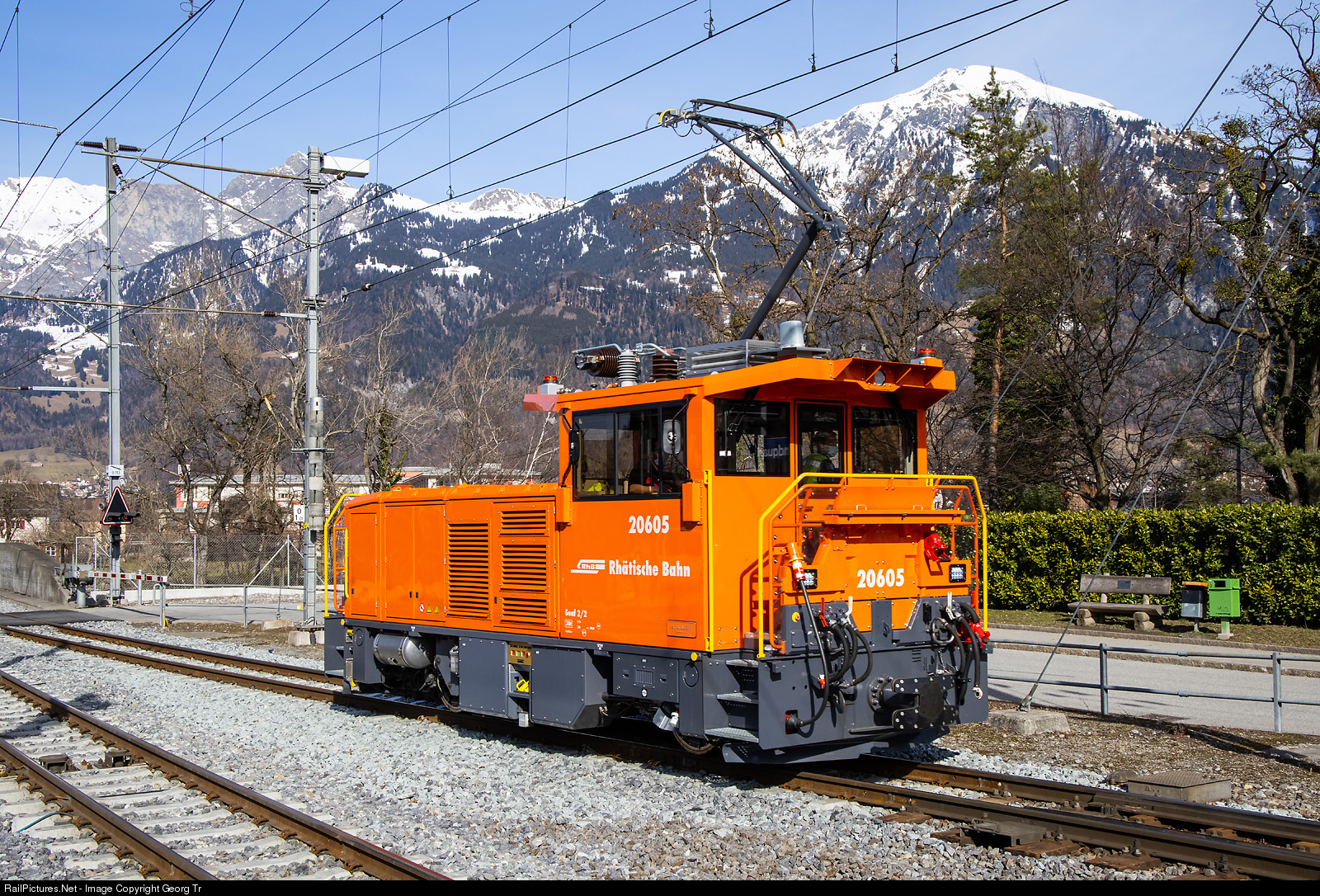 | New shunter locomotive from Stadler Rail with electro and battery drive, Geaf 2/2 # 20605 of the Rhaetian Railway in Landquart. The RhB got 7 of this locomotives in 2020 to replace older, mostly diesel powered shunters. |