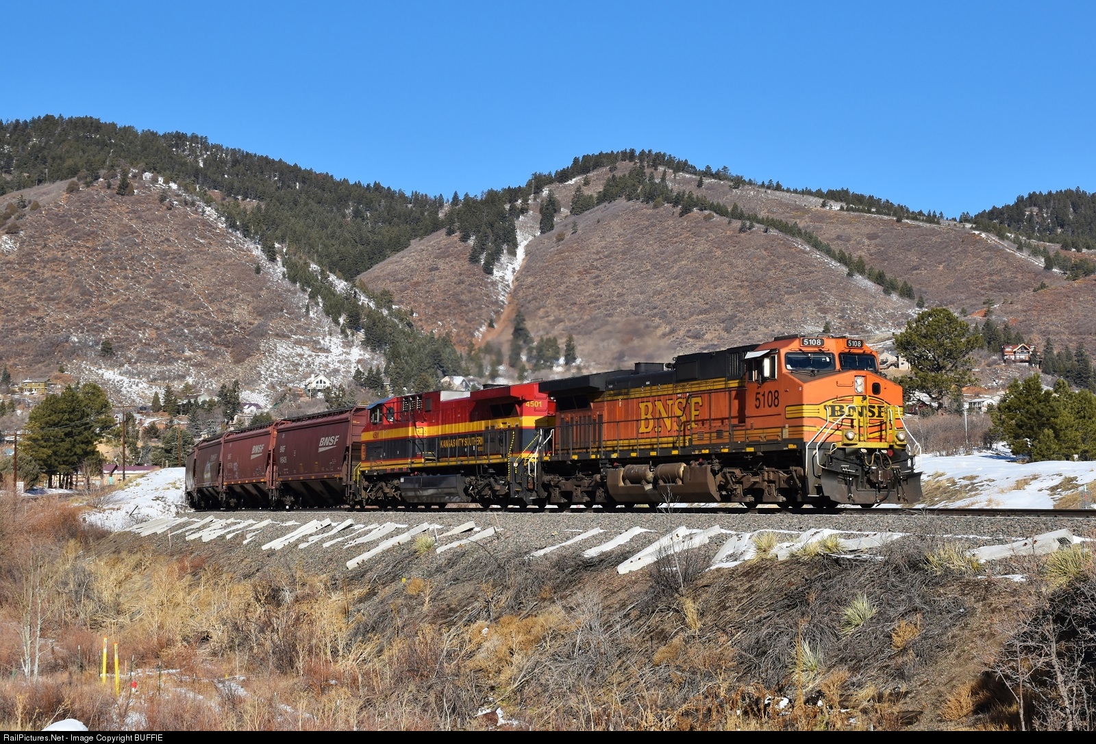 BNSF 5108 (ES44AC) leads a Kansas City Southern unit and a freight through Palmer Lake, Colorado.