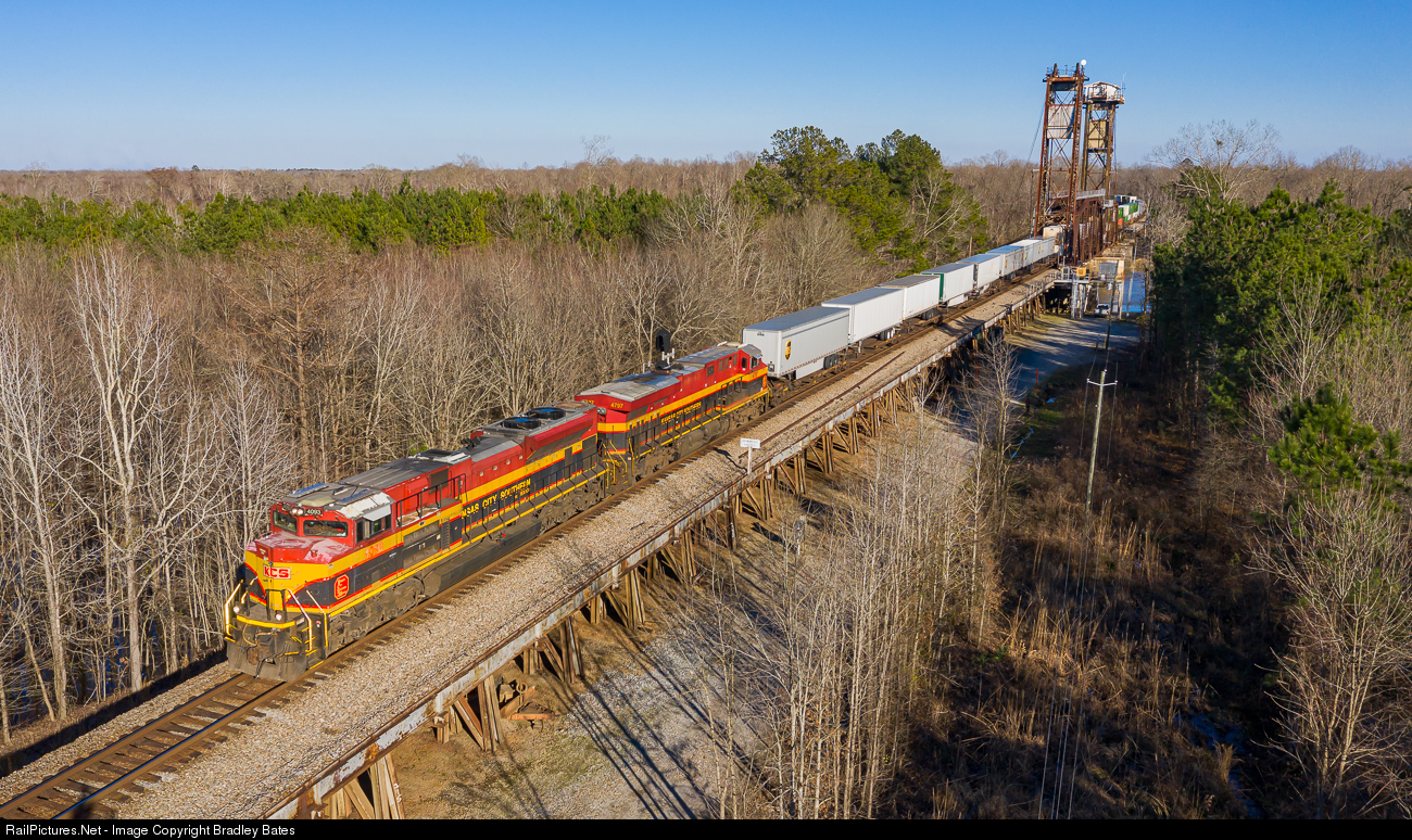 A pair of Kansas City Southern Locomotives lead Norfolk Southern Intermodal Train I19 (extra 219) south across the Warrior River Bridge in Eutaw, AL., on their way to Dallas, TX.