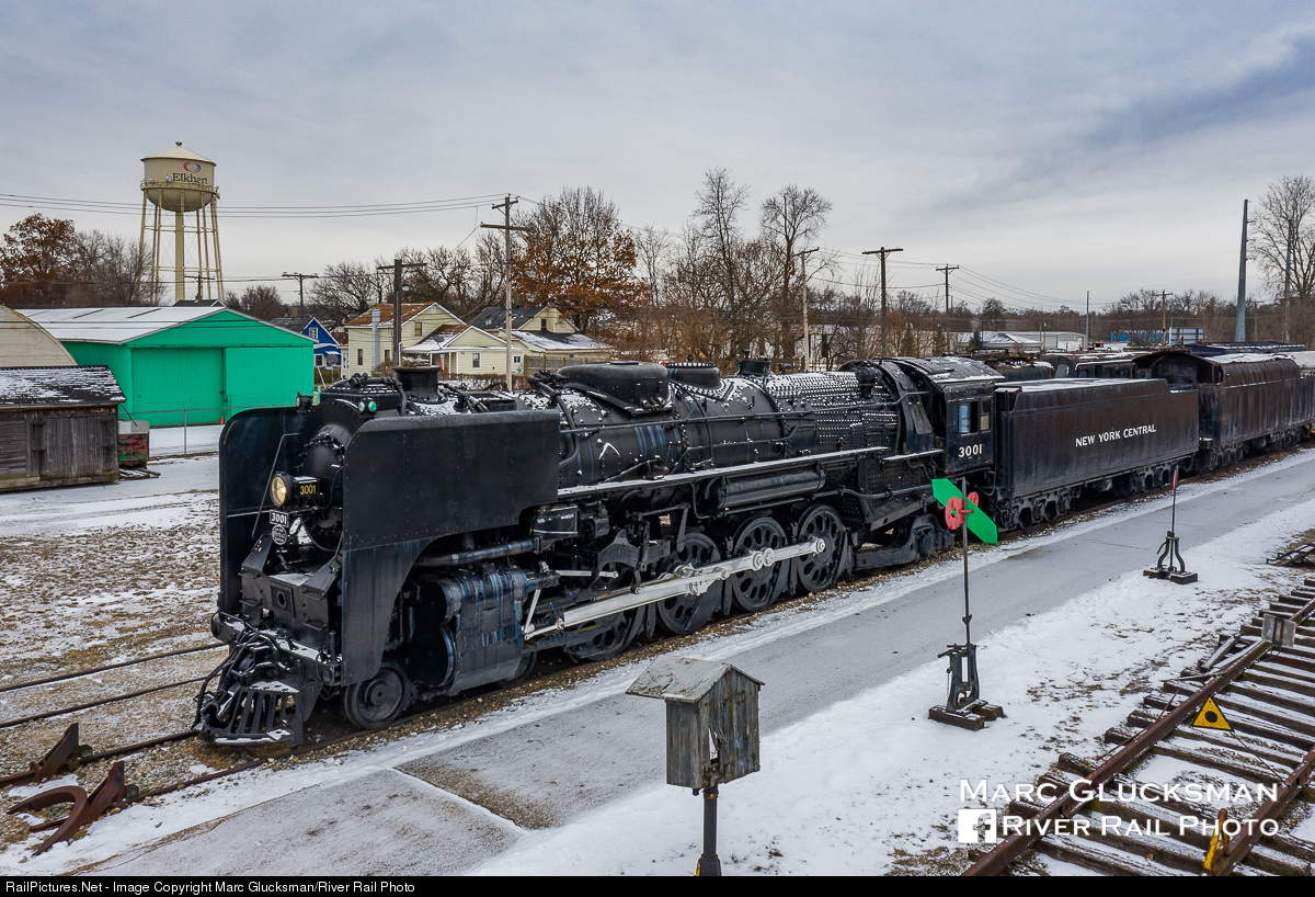 Mohawk Means Mountain. New New York Central 3001 (4-8-2, Alco, 1940) is the largest surviving steam engine of the NYC fleet. While on other railroads this wheel arrangement was referred to as “Mountain”, the name did not quite fit on the mostly flat Water Level Route, and the Central referred to these engines by the name of the river that paralleled much of its route across New York State. Presently residing at the National New York Central Museum in Elkhart, Indiana, it is 1 of 2 NYC Mohawks still in existence out of 600 produced, as seen after a light snow on the morning of Sunday, January 24, 2021.