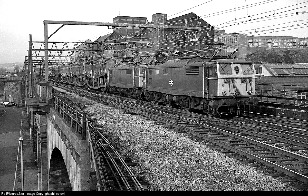 | Well into their final year of operations, 76024 + 76006 head east through Sheffield Victoria with an empty car-tic train. |