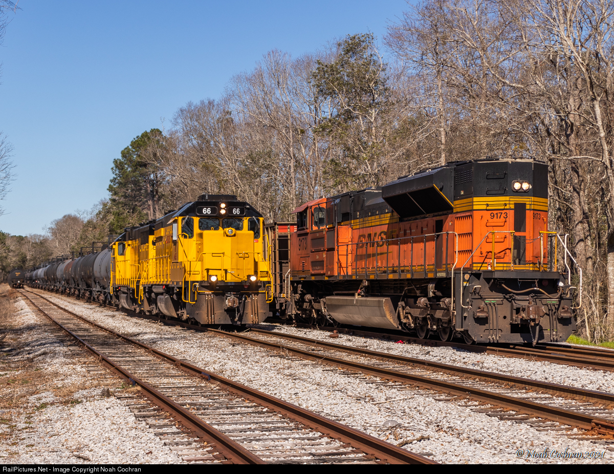 | MSE's Evanston Yard in Lucedale, MS. The DPU of empty coal train C705 tied down idling with the southbound MSE 51 passing by on their way to Moss Point. MSE 66, MSE 70 & BNSF 9173 |