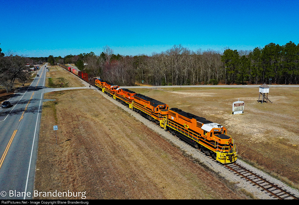 | Georgia Central L782 passes through the small town of Tarrytown Georgia with GC 2115 leading the 10,000+ ton train. |