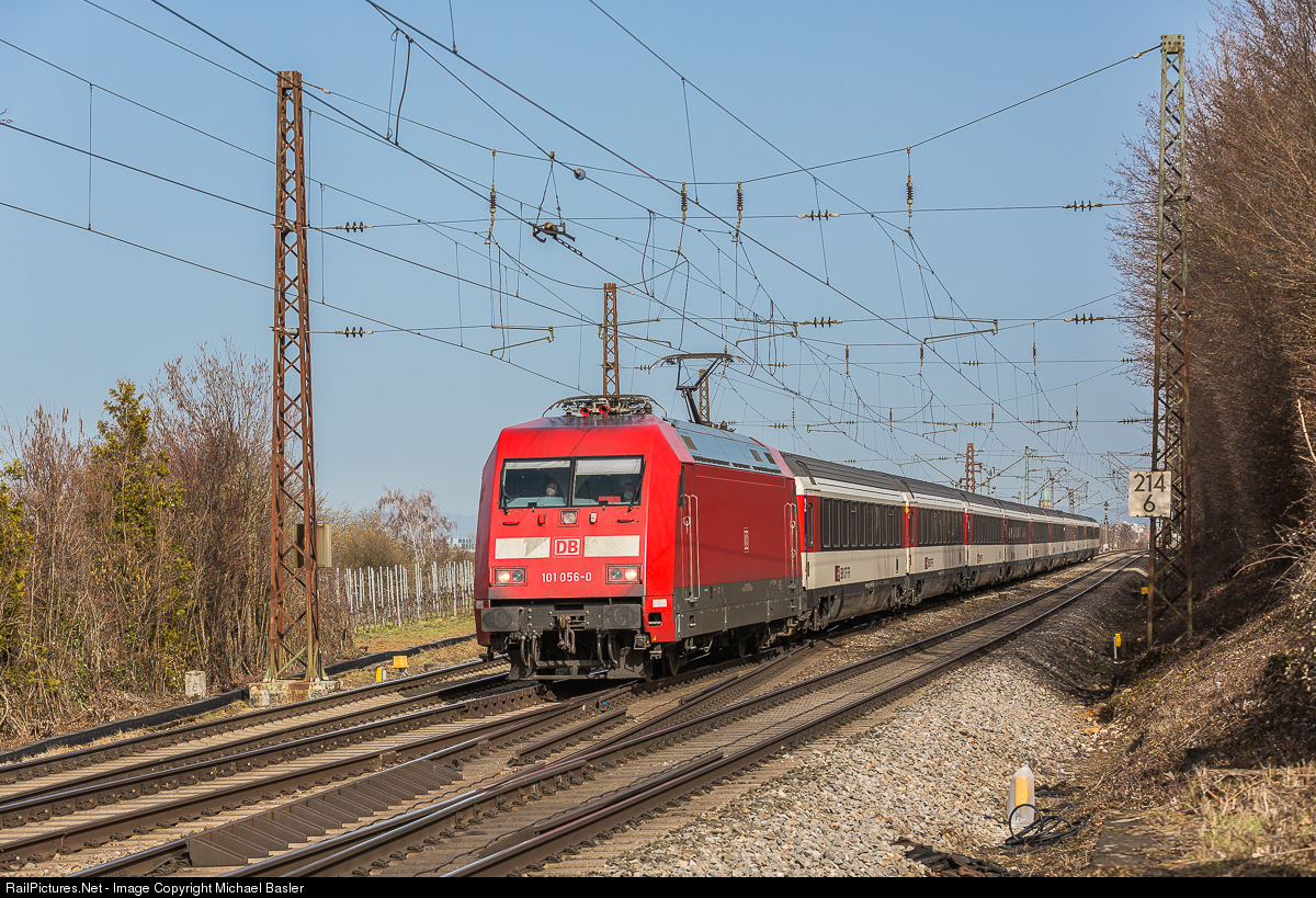 | With a delay of 35 minutes, 101 056-0 races through the junction in Leutersberg. The destination of this set is Interlaken Ost in Switzerland. The train started in the morning in Hamburg Altona. |