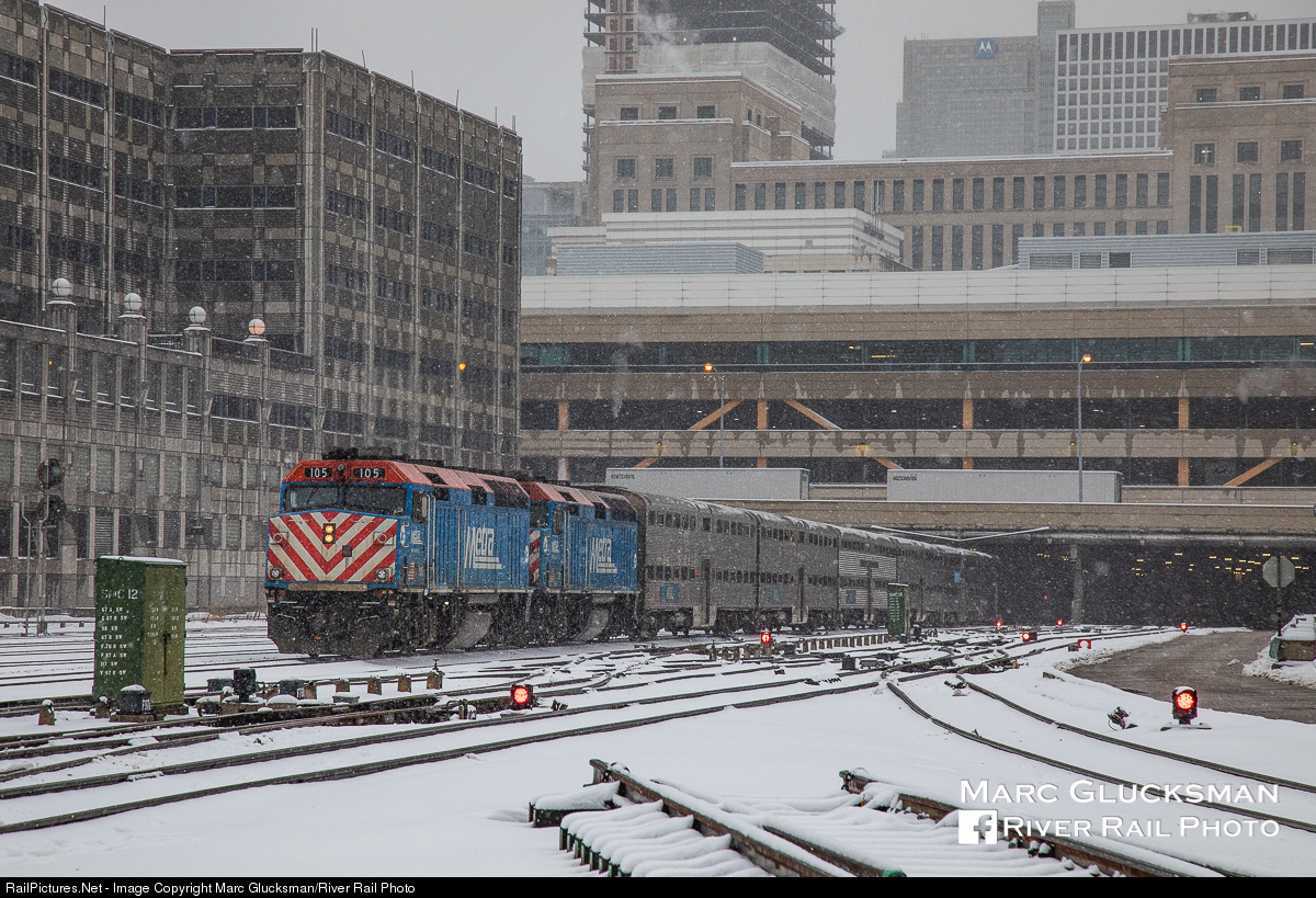 Two For One. Metra F40PH-3s 105 (9/1977) and 119 (10/1977) have just passed under CP Taylor and arrive at Chicago Union Station on the evening of Tuesday, January 26, 2021. The streamlined E and F units of the legacy railroads were already older in age, but also in technology as their departure was expedited by the introduction of Head End Power to the coaches of America's railroads. RTA would become the first commuter railroad to purchase the F40PH, which has outlived expectations as they enter their fifth decade of service.
