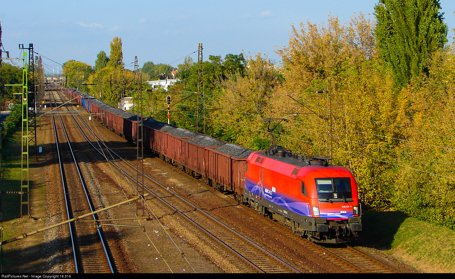 | ÖBB 1116 012 reached Budapest and is already on the track leading to the orbital railway. The locomotive's special livery for MÁV Cargo was short-lived: that company was the former subsidiary of Hungarian State Railways MÁV, which was sold to Austrian Federal Railways ÖBB the previous year (after which the new mother company transferred a number of locos to the new subsidiary including the one shown), and was renamed Rail Cargo Hungaria the next year. |