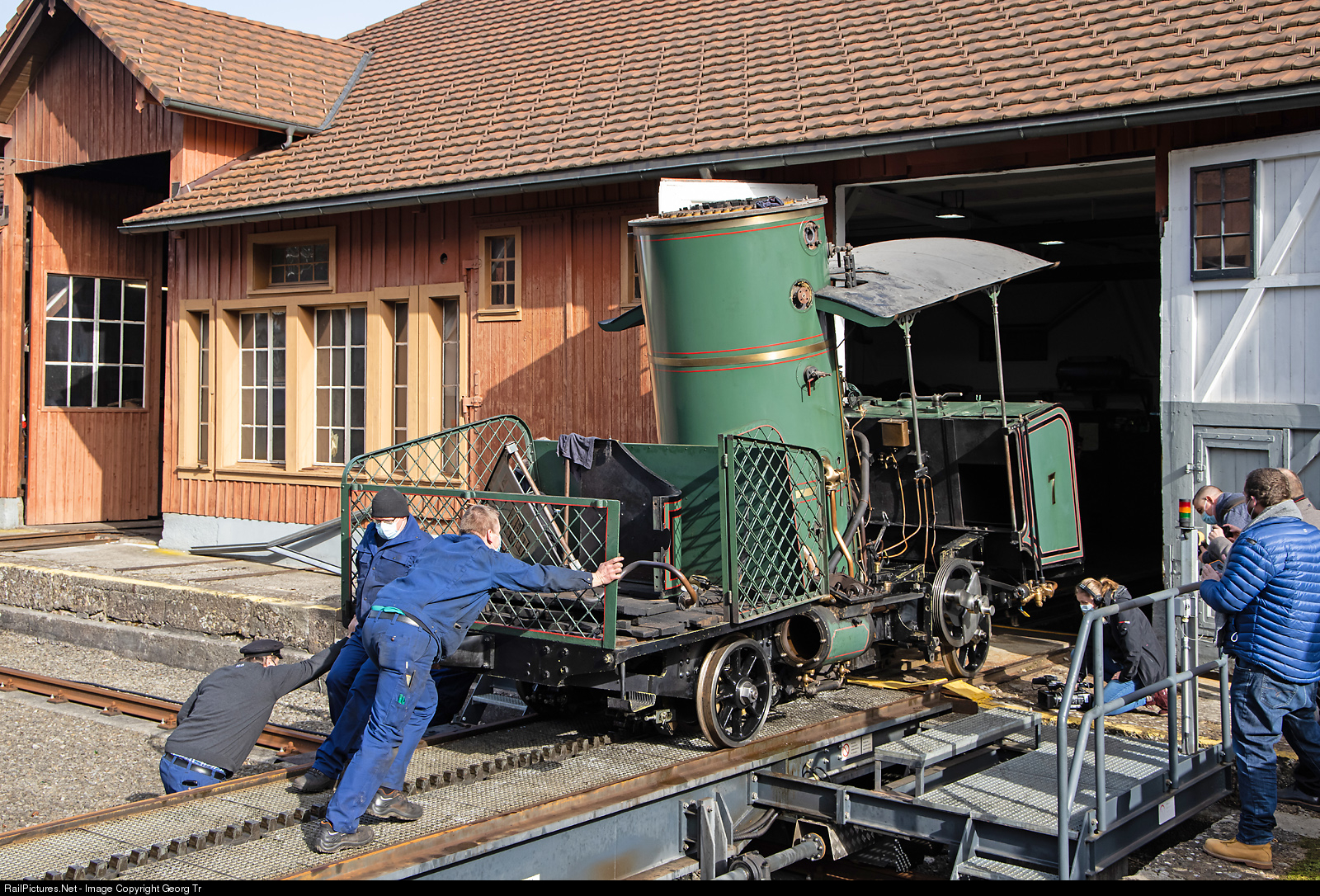 The cogwheel steamlocomotive H 1/2 # 7 of the Rigibahnen was built by SLM in 1873 and retired in 1937. Since 1959, it has been part of the collection of the Swiss Transport Museum in Lucerne. The locomotive was already put back into service in 1996/1997 (125 years of Rigibahnen) and 2007 (150 years of Swiss Railways) and ran on the Rigi. Now it will be overhauled and put into service once again in 2021, for the 150th anniversary of the Vitznau-Rigi Railway. On this day, the crankshaft, which directly drives the drive gear on the rear axle with a gear wheel, was mounted. Here, the locomotive is being pushed into the old workshop in Goldau by Martin Horath's team for further work.