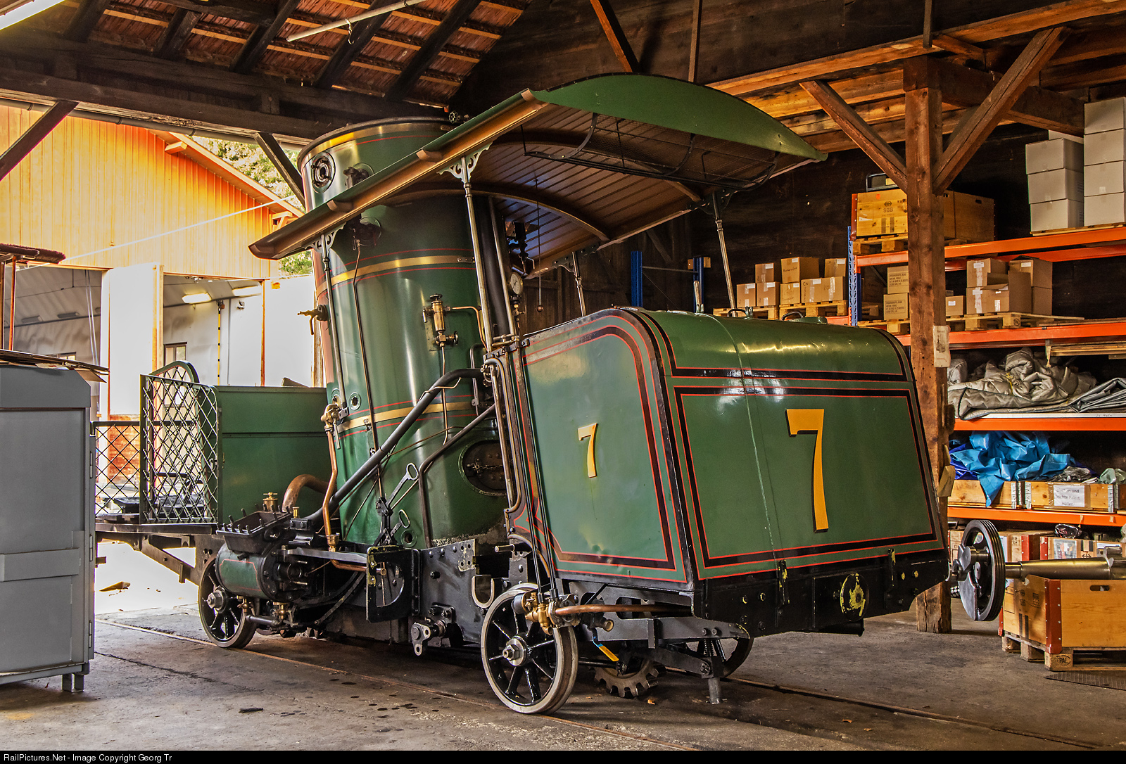 The cogwheel steamlocomotive H 1/2 # 7 of the Rigibahnen was built by SLM in 1873 and retired in 1937. Since 1959, it has been part of the collection of the Swiss Transport Museum in Lucerne. The locomotive was already put back into service in 1996/1997 (125 years of Rigibahnen) and 2007 (150 years of Swiss Railways) and ran on the Rigi. Now it will be overhauled and put into service once again in 2021, for the 150th anniversary of the Vitznau-Rigi Railway. On this day, the crankshaft (new built in 1996), which directly drives the drive gear on the rear axle with a gear wheel, was carefully put in. Here, the crankshaft can be seen on the right, while the locomotive is waiting for this work.