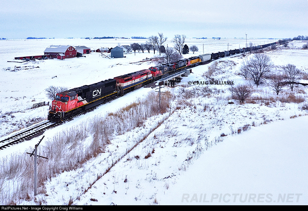 | A late 337 is about 10 miles from their destination at Waterloo. The train passes over Indian Creek east of Raymond on the CN Dubuque Sub. Little bit of everything in the consist today including the DAIR 3026 which is heading back to the DAIR at Sioux City after a trip to NRE in DIxmoor for rebuilt trucks. The rear 2 CN motors were picked up at Freeport after eastbounds set them out after making Scales Mound Hill. |
