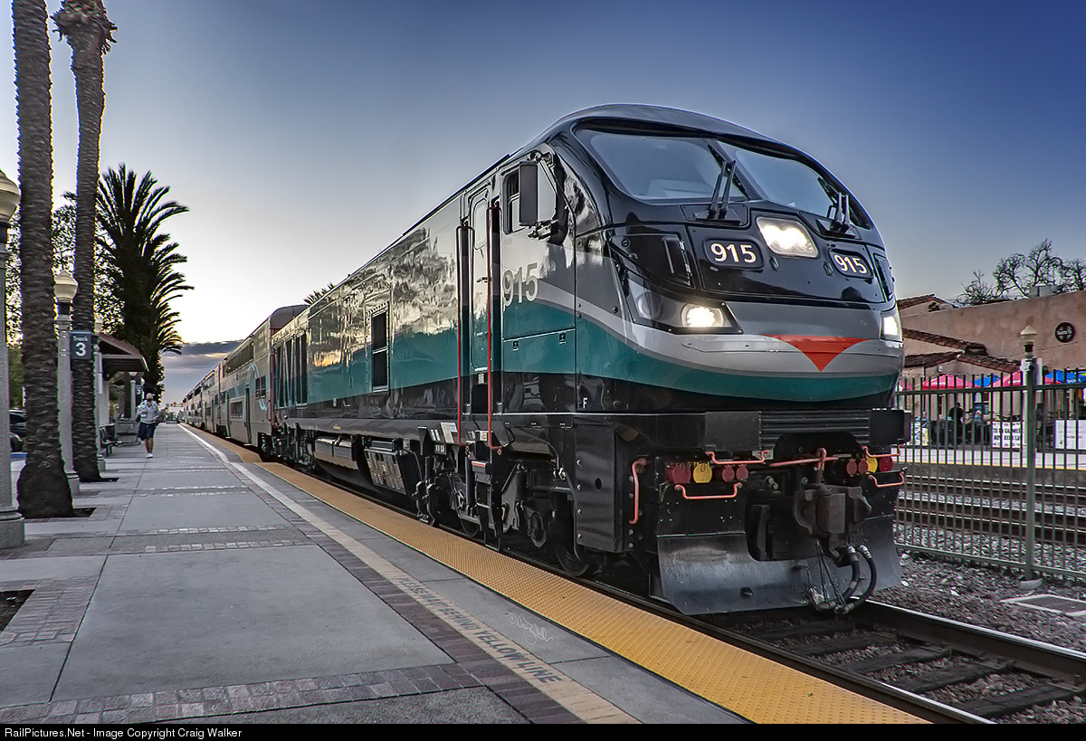 Metrolink’s newest service serves the Perris Valley, southeast of Riverside, opened on June 6, 2016. Train 708 is a "91/Perris Valley Line" train, and is seen making the third stop on its trip from Los Angeles to the Perris South station, which is, as the name implies, south of downtown Perris. This five-car train is led by four-year-old F125 915, built in February 2017. (Fullerton, California – February 23, 2021)
