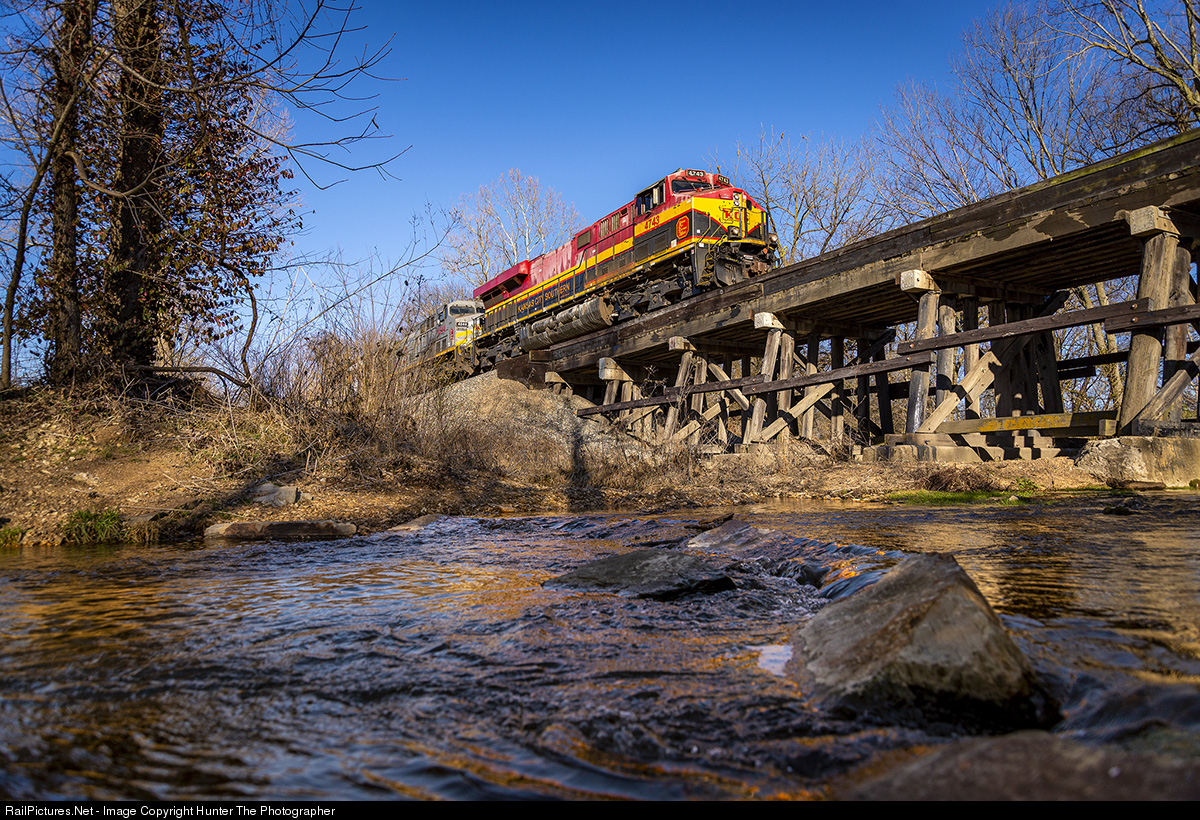 | A battered ES44AC leads a southbound KCS manifest train across Sager Creek in Siloam Springs, AR on the sunny afternoon of February 24, 2021. |