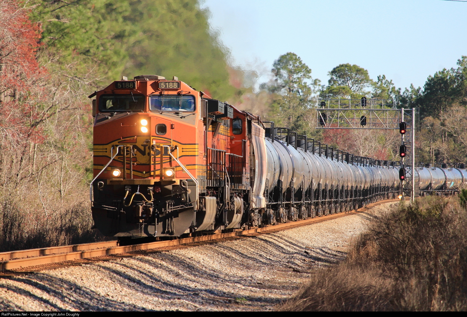 | Having completed their run up the Folkston funnel, BNSF 5188 and BNSF 5178 lead a westbound empty ethanol train towards Waycross, Georgia. |