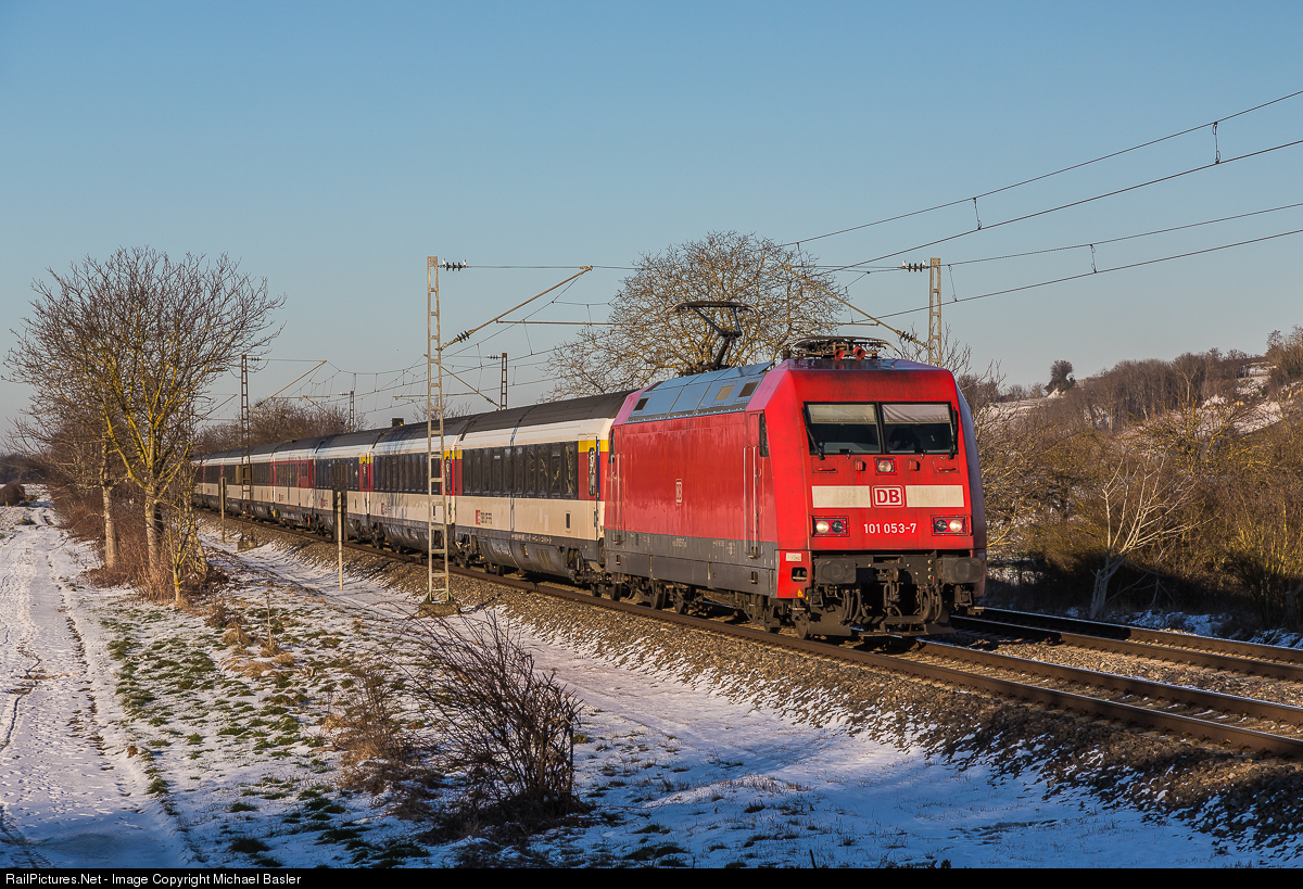 | 101 053 with EC 9 passed Hügelheim more than an hour late. Due to the snowfall of the last few days, the timetable structure was mixed up in the whole of Germany, which ended with considerable delays. |
