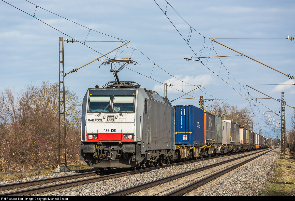 186 108 from Railpool is pulling its long container train towards the Swiss border.