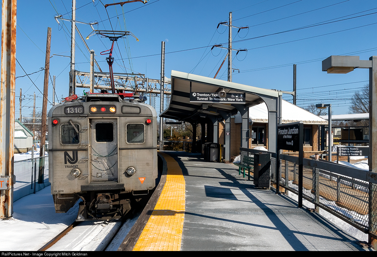 A set of NJT's GE Arrow III EMU's prepare for the 2.7 mile trip shuttling passengers from Princeton Junction along the NEC to the Princeton University campus, near downtown Princeton, NJ. The bland station seen in the background is the smaller of two stations built in 1987 that replaced a similar small westbound station built in the mid 1950's that itself, replaced an impressive single stately two-story brick station built in 1893. The eastbound side now has a large modern two story station.