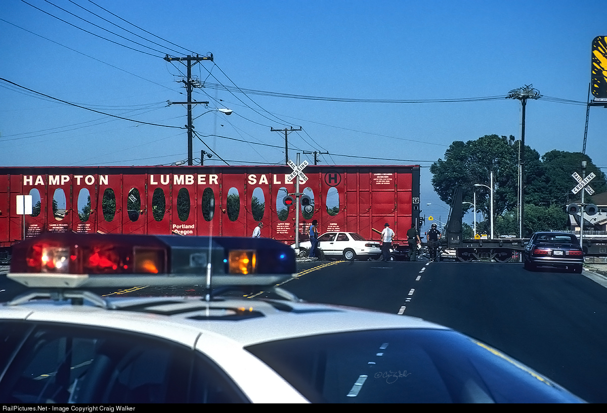 As Southern Pacific's Huntington Beach Hauler was heading west (compass north) on the Stanton Branch back to Anaheim, at just 25 miles per hour, a moron in a white Nissan Sentra somehow failed to notice the flashing red lights on the crossbucks and the large GP9 (SP 3428) approaching the grade crossing. So, thanks to this idiot, Chapman Avenue was closed way longer than it would have been if they hadn't interfered with its journey. (Stanton, California - September 1992). Click HERE to see more photos of this accident.