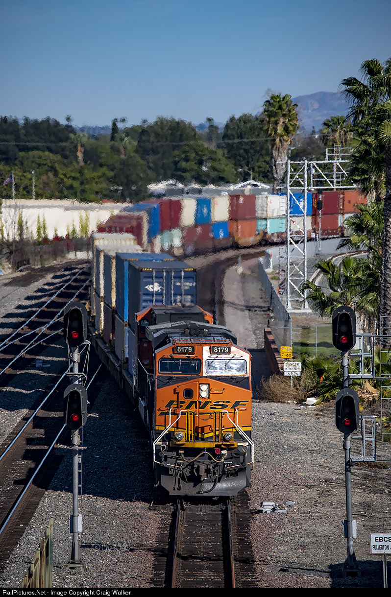 At the eastern end of the Fullerton Transportation Center – the city’s Amtrak and Metrolink station – is Fullerton Junction. At this point, BNSF’s triple-track San Bernardino Sub reduces to just two mainlines, and two mainlines split off to become Metrolink’s Orange Sub, heading to Oceanside (where it then becomes San Diego Northern’s San Diego Sub to San Diego). As BNSF train S-LBELPC1-22, with ET44C4 3877 up front and ES44C4 8179 on the rear, passes through the Junction, it switches from Track 3 to Track 2, as here is where Track 3 becomes Metrolink’s Track 2. BNSF’s Track 2 splits here as well to become Metrolink Track 1. It’s like a math word problem! And there will be a test later… (Fullerton, California – February 24, 2021)