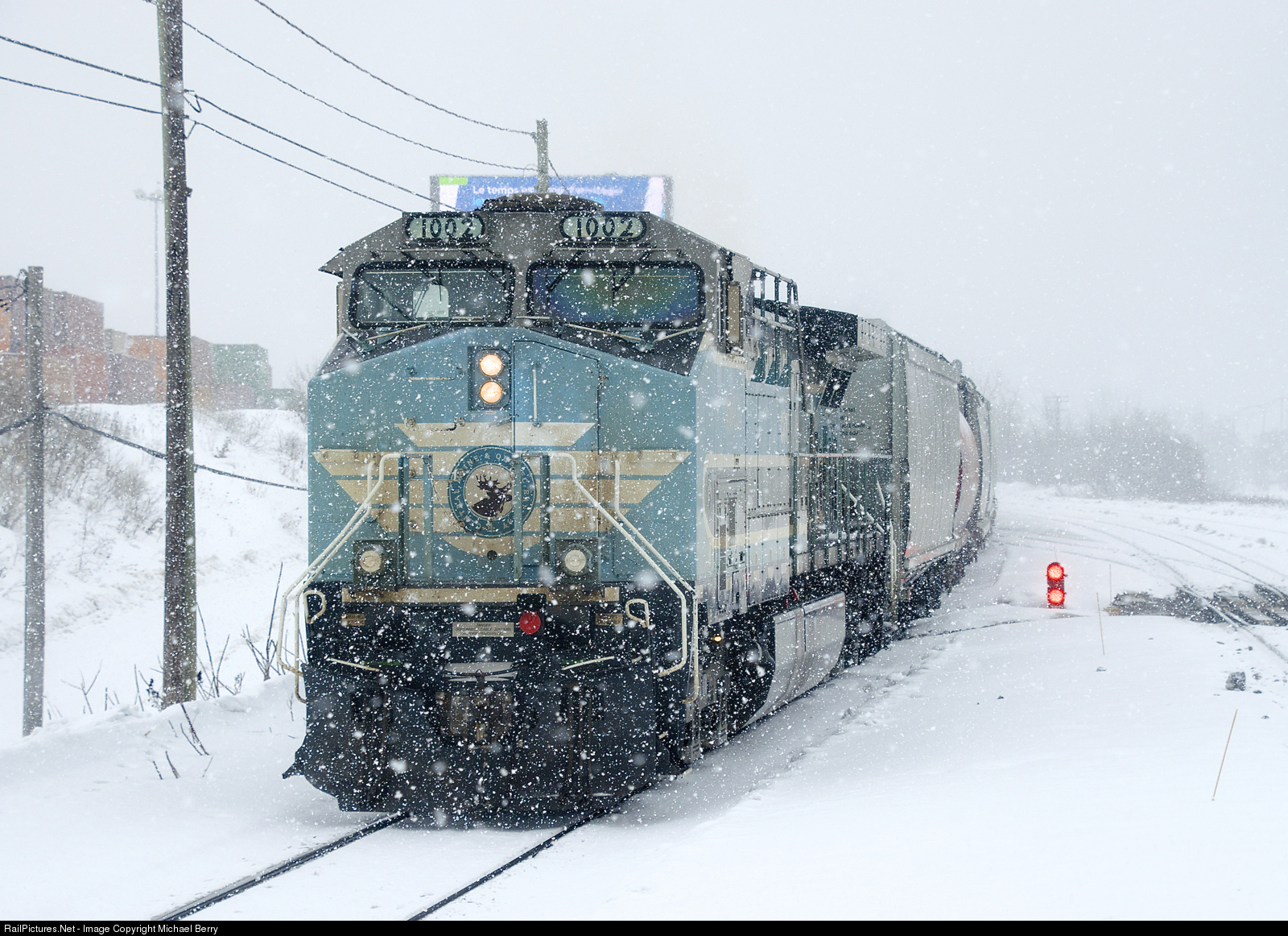 | Thick snow is falling as CEFX 1002 brings up the rear of CP 112. After yarding the intermodal portion of its train in Lachine IMS Yard, the head end and mid-train power went light to pick up autoracks and grain cars from the tail end of the train, which had been left on track three of the Vaudreuil Sub. |