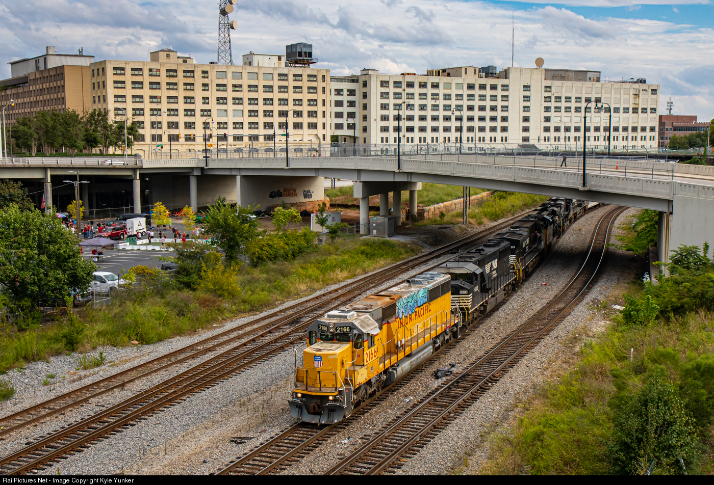 A grungy Union Pacific SD60 leads Norfolk Southern train #322 into Atlanta from Macon rolling through the junction at 'Spring' with the old Southern Railway offices sitting dormant in the background.