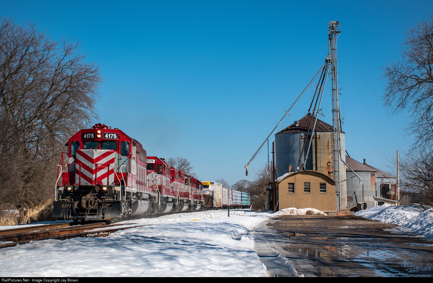 | WSORs T-004 road freight screams out of Waukesha, and into the tiny “town” of Williams... that consists of a sole grain elevator. Always a treat to hear 4 matching SD40s screaming in 8. |