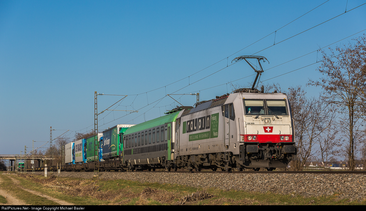 | The locomotive 186 909 rented by Cargologic AG to BLS travels on the rolling road from Freiburg to Novara, in northern Italy. |
