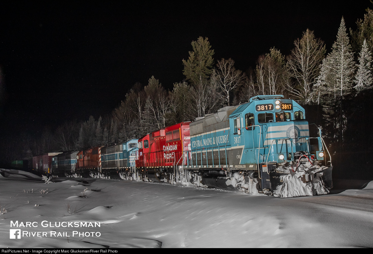 Interesting Things Come To Those Who Wait. Canadian Pacific Railway Train 250 experienced mechanical difficulties during its journey on Saturday, February 27, 2021. Many hours off of its normal daylight running time, it recrewed in Jackman, Maine after 1800. The CMQ/LTEX 3817 (GP38-3) and CP 2318 (GP20C- ECO) were added to CMQ 9011 (SD40-2F) CP 6024 SD40-2 CMQ 9020 (SD40-2F) for a robust all EMD power set, seen here crossing State Route 6 near Tarratine in Rockwood, Maine.