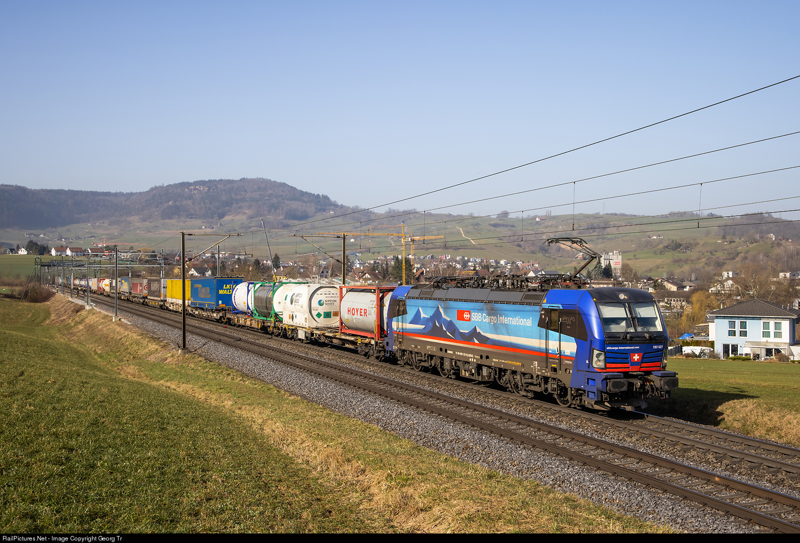 | Siemens Vectron 193 # 527 "Main" of the Süd Leasing Gmbh, rented by SBB Cargo International, is pulling the HUPAC intermodal train 43037 from Ludwigshafen (Rhein) BASF Ubf/Germany to Gallarate/Italy (Busto Arsizio Terminal) on the Bözberg north ramp between Frick and Hornussen. |