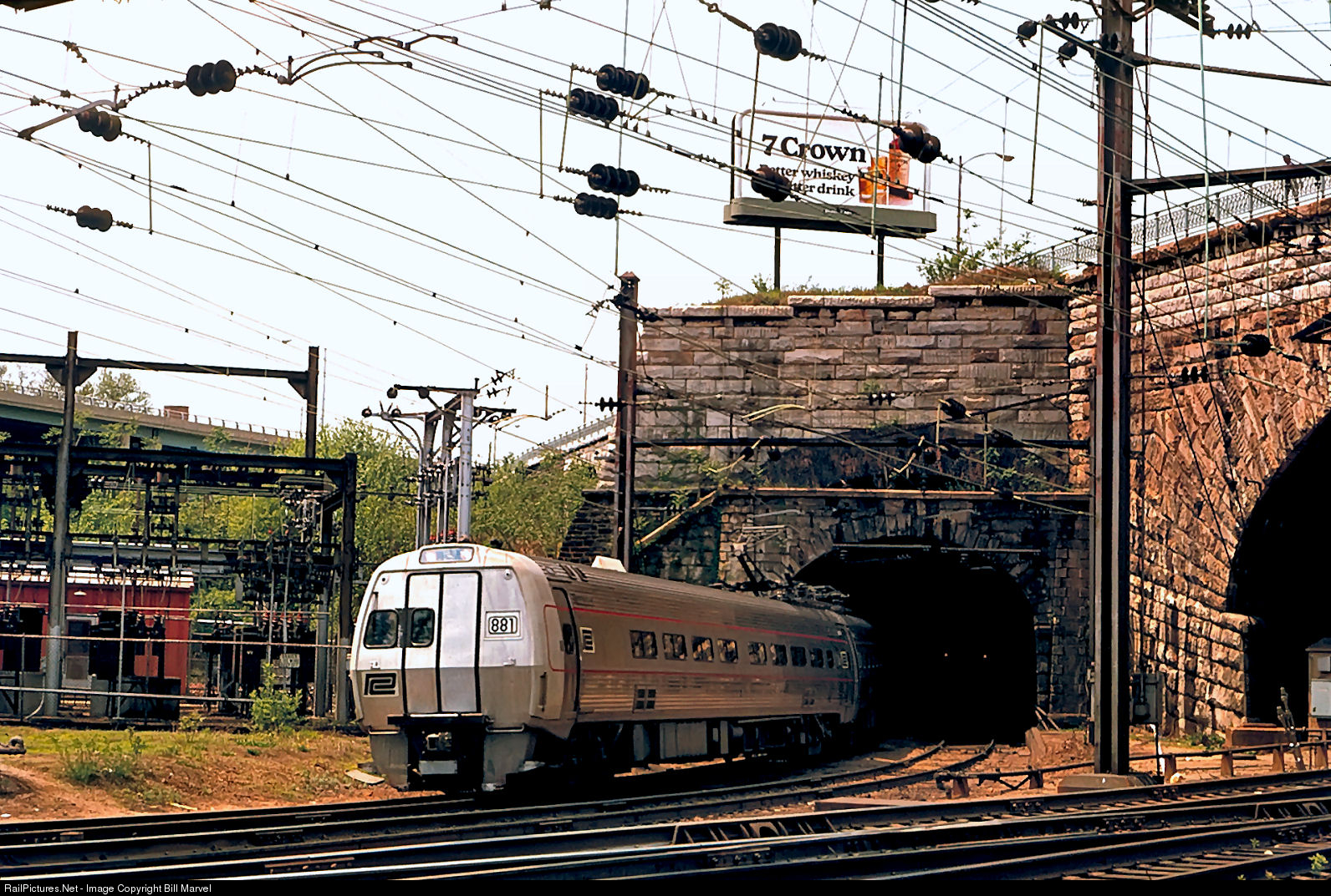 The future emerging from the past, two-year-old Budd Metroliner 881 pops out of the 97-year old Baltimore & Potomac Tunnel, constructed in 1873 to provide Pennsylvania Railroad trains direct access to Washington, D.C. Twice enlarged over the years and soon to be expanded again, in May, 1970, the 7500-foot tunnel remains a bottleneck on the Northeast Corridor. But business clients and politicians in the 34-seat lead parlor car will soon be unwinding with cocktails at 110 miles an hour and passengers in the 76-seat coaches will beat Eastern Airlines competing shuttle door-to door. Despite early glitches, demand is high and the six daily round-trips will soon grow to seven and eventually a dozen.